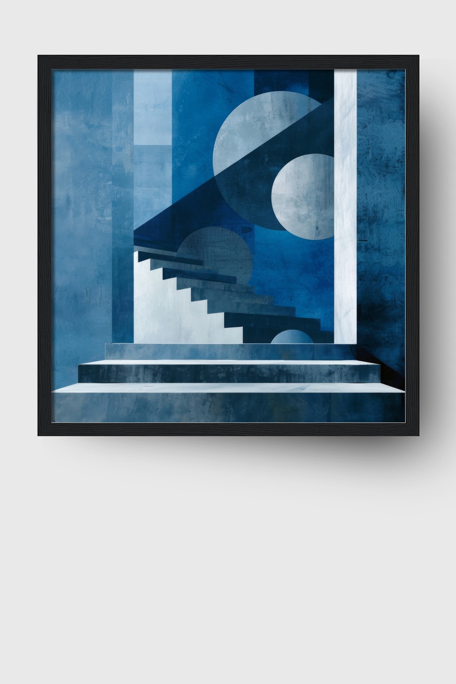 Minimalistische Treppe hebt sich durch klare Kontraste und abstrakte Kreise hervor.