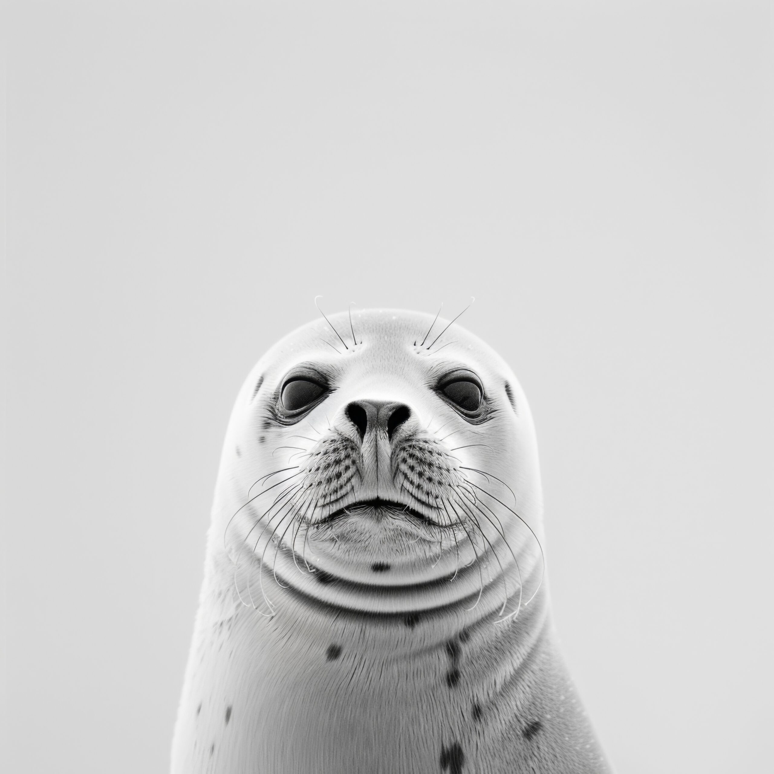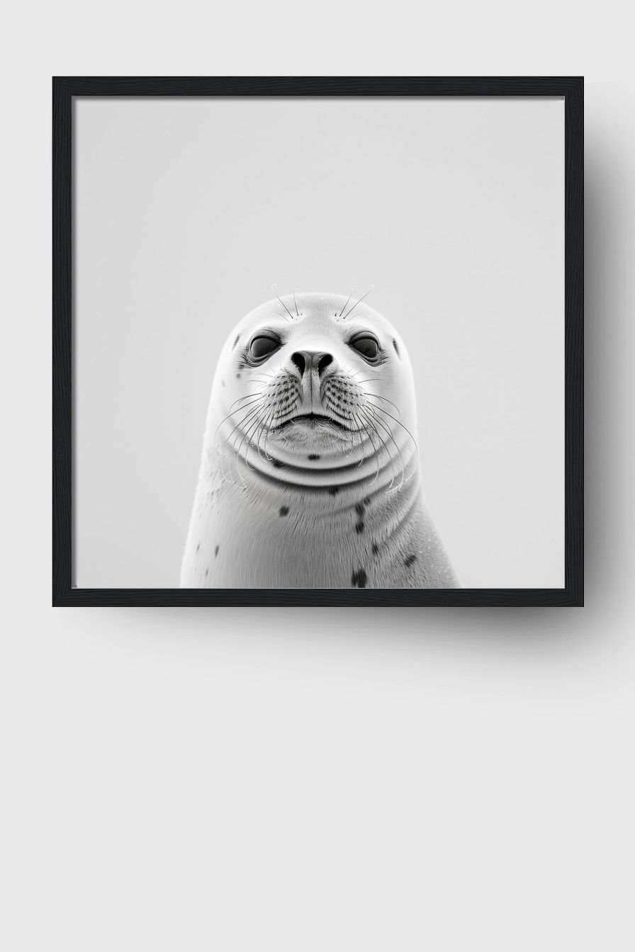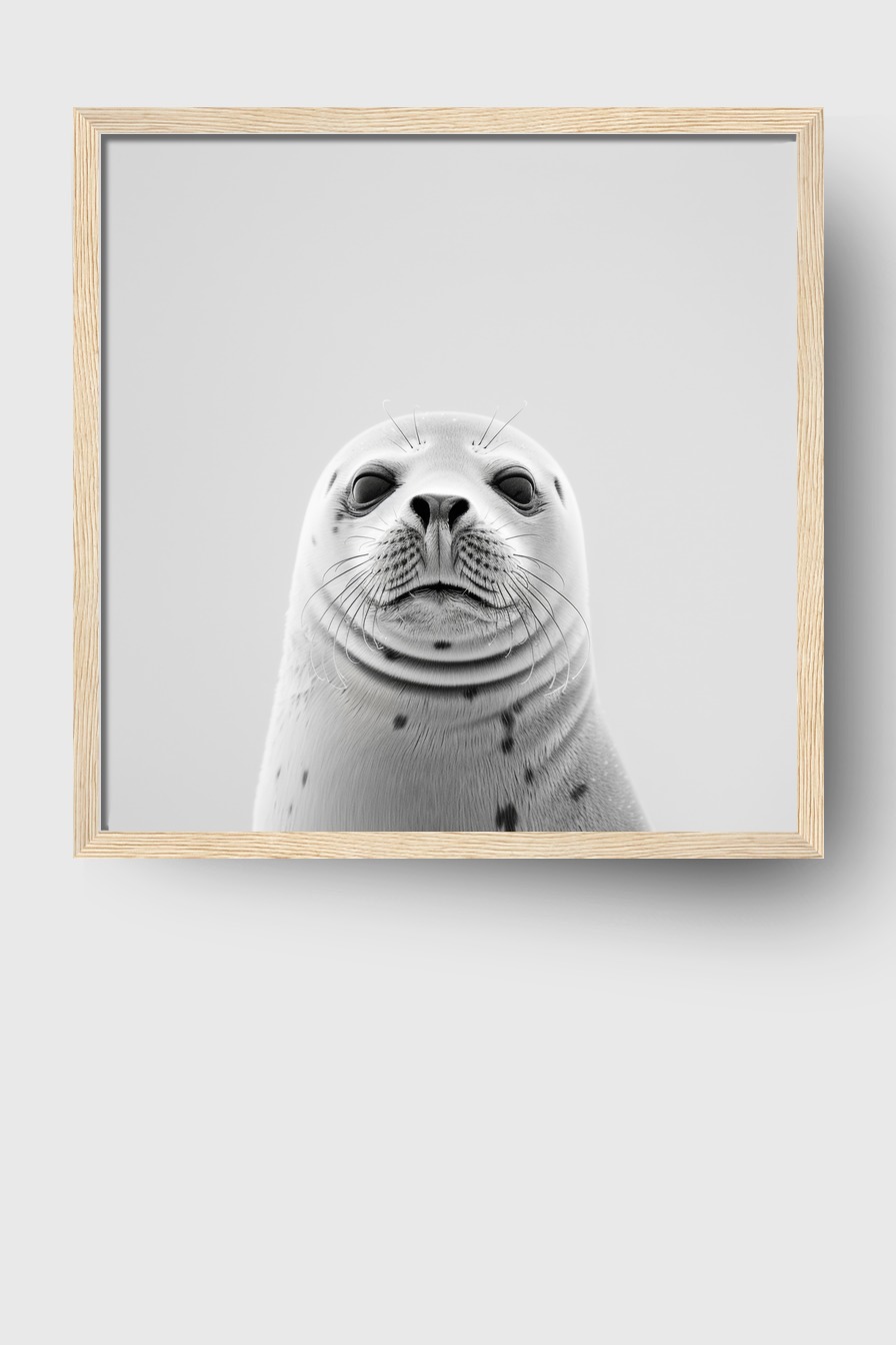Das klare Seehundgesicht wirkt im Raum ruhig und fokussiert mit hoher Bildschärfe.