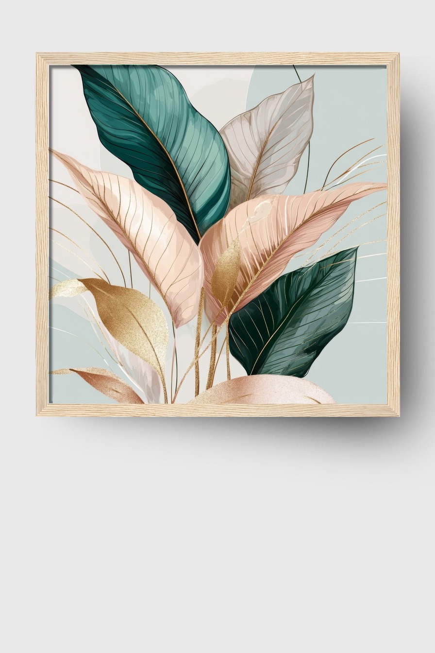 Botanischer Kunstdruck eines Blätter Arrangements mit goldenen Akzenten in Grün und Beige als Poster, Kunstdruck und Wandbild