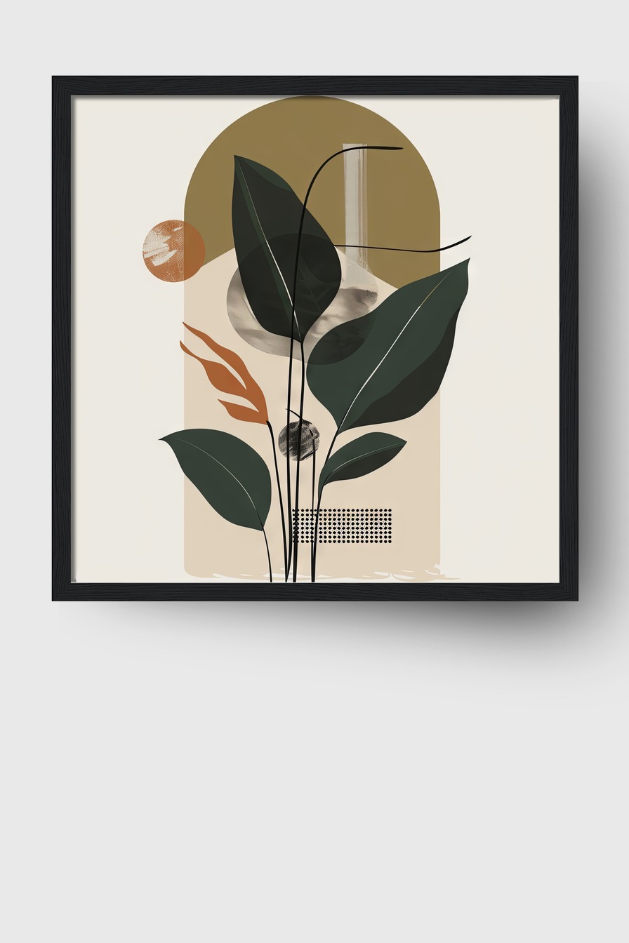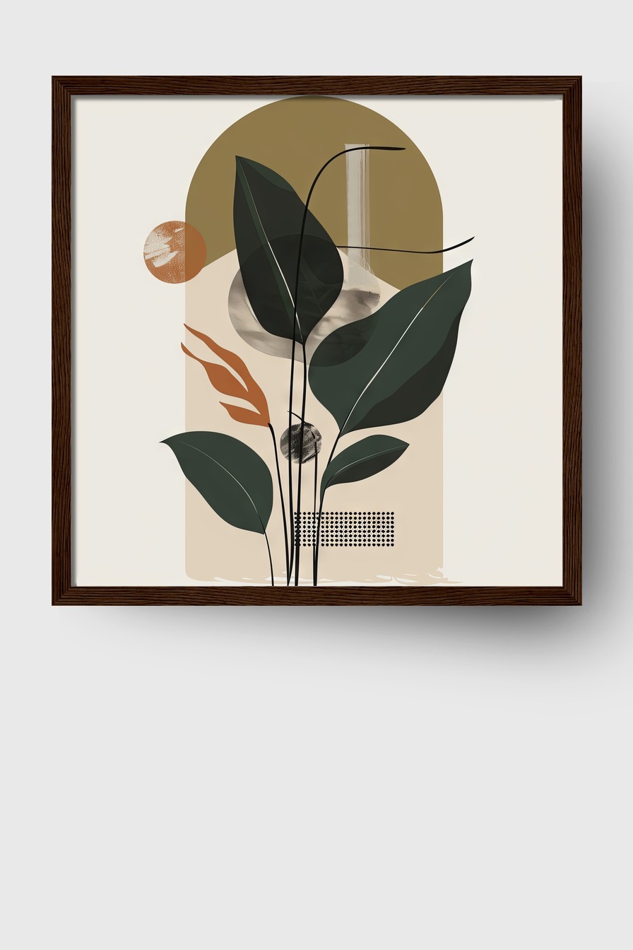 Diese Grafik zeigt stilisierte grüne Blätter vor abstrakten geometrischen Formen in warmen Beigetönen. Das Design verbindet natürliche Elemente mit moderner Kunst.
