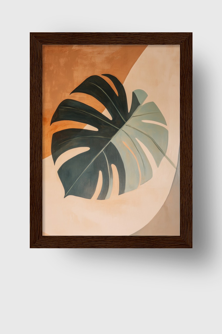 Das Motiv zeigt ein großes Monstera Blatt in gedeckten Farben vor abstraktem Hintergrund. Die warmen Erdtöne schaffen eine ruhige Atmosphäre.