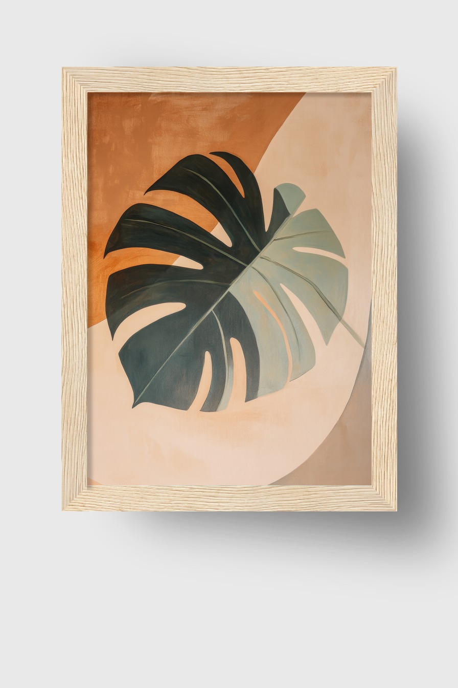 Poster mit abstraktem Monstera Blatt in Beige und Braun vor geometrischem Hintergrund