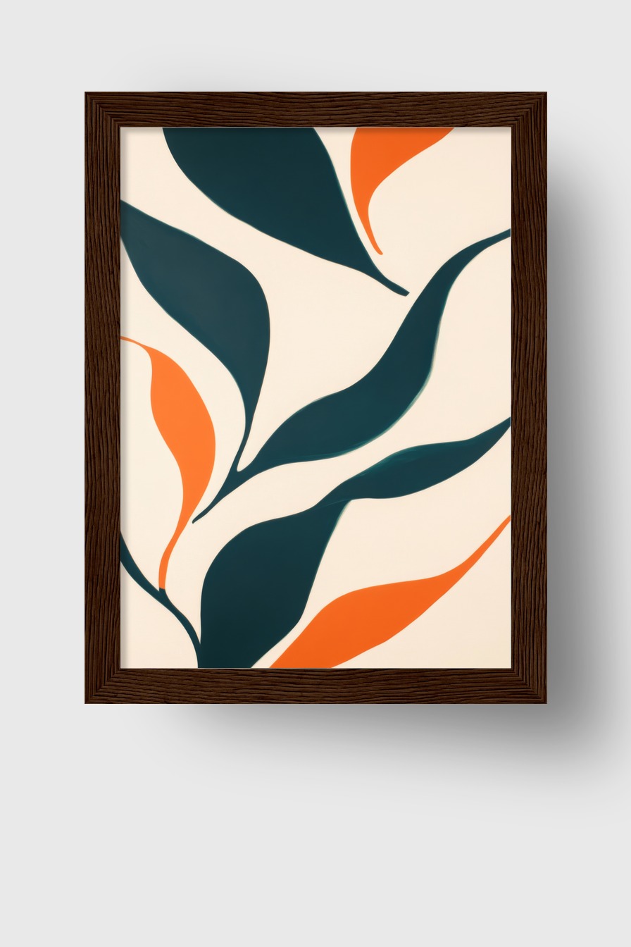 Das Motiv zeigt abstrakte Blattformen in Dunkelgrün und Orange auf einem beigen Hintergrund. Die weichen, geschwungenen Formen wirken lebendig und modern.