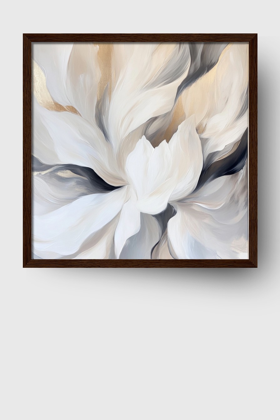 Eine große weiße Blüte auf halbmatter Posteroberfläche (170 g/m²) hinter bruchsicherem Plexiglas in einem FSC-zertifizierten Kiefernholzrahmen. Lieferung fertig zum Aufhängen mit Aufhängeset.