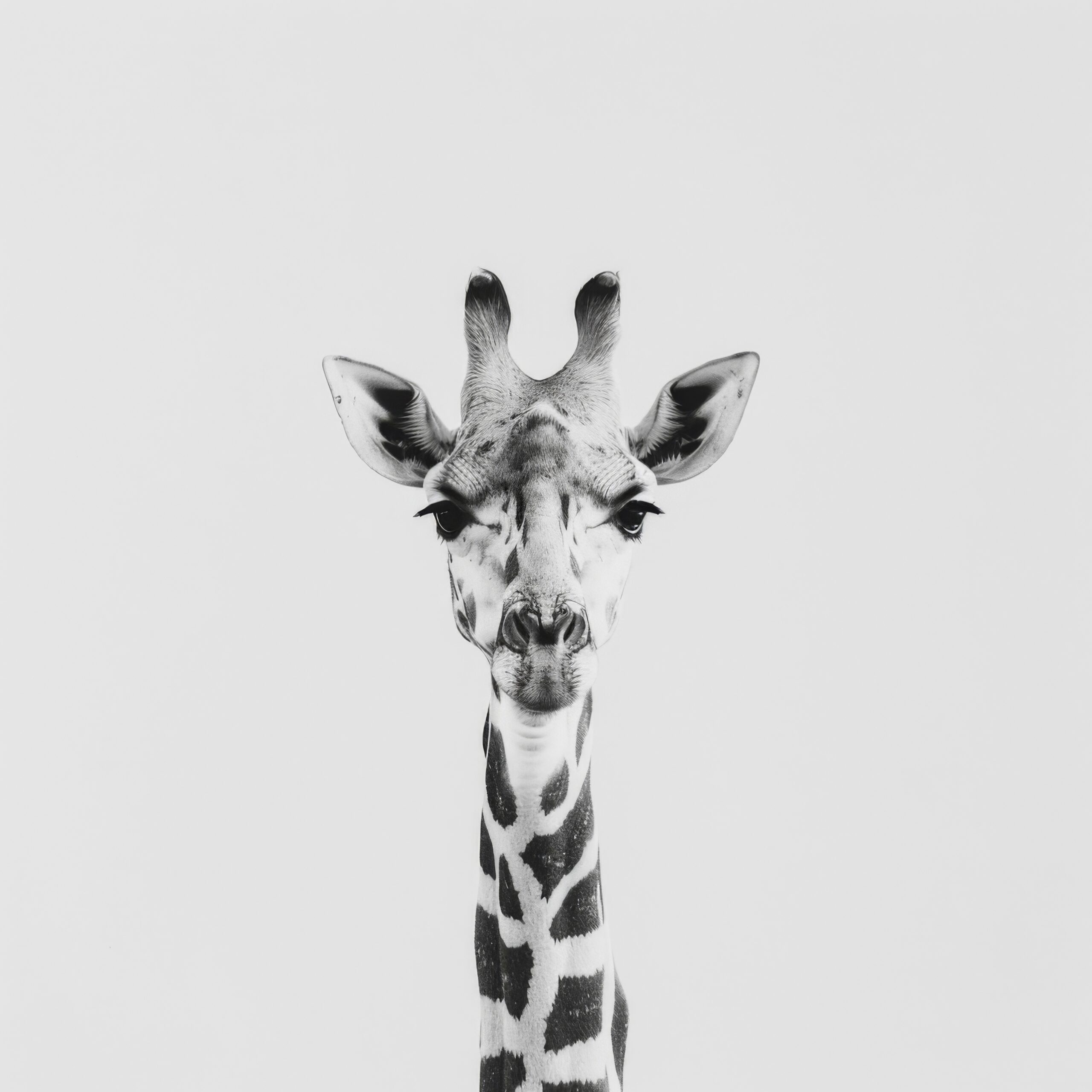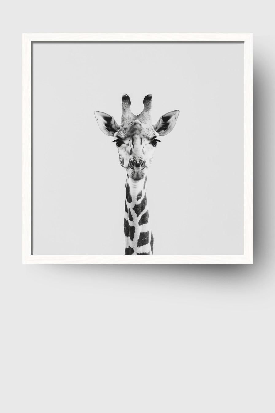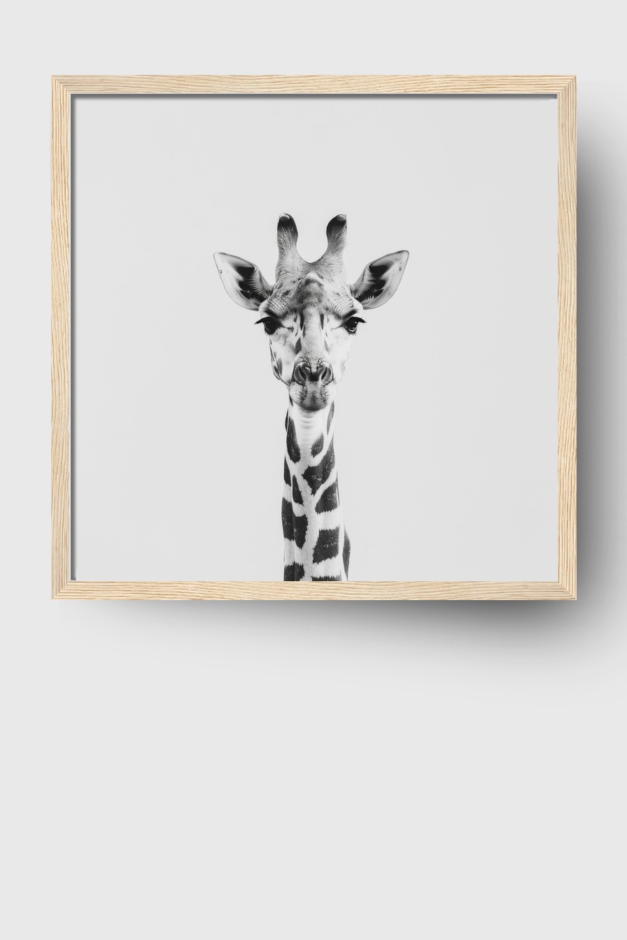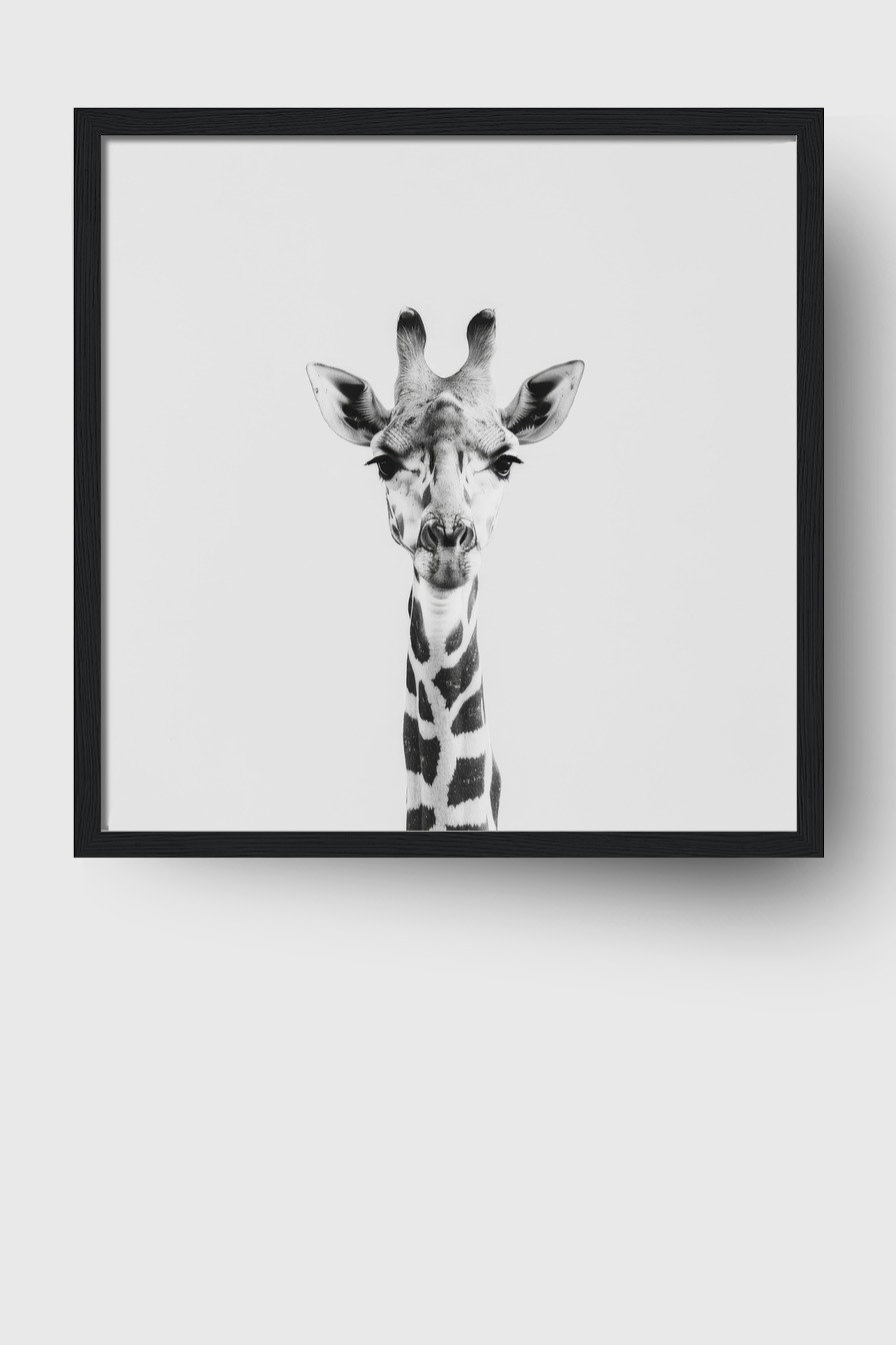 Im Raum fällt der klare, fast monochrome Stil sofort ins Auge und bringt Ruhe in die Umgebung. Die Darstellung wirkt präzise und dennoch sanft, ideal als Blickfang, der zugleich zurückhaltend bleibt. Das Gesicht der Giraffe wirkt fast wie ein raumgreifendes Kunstobjekt.
