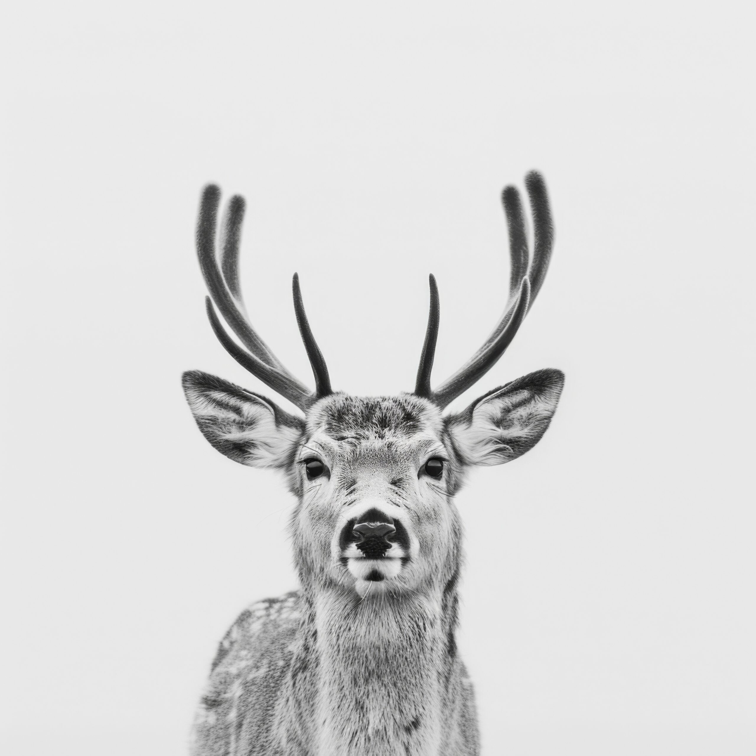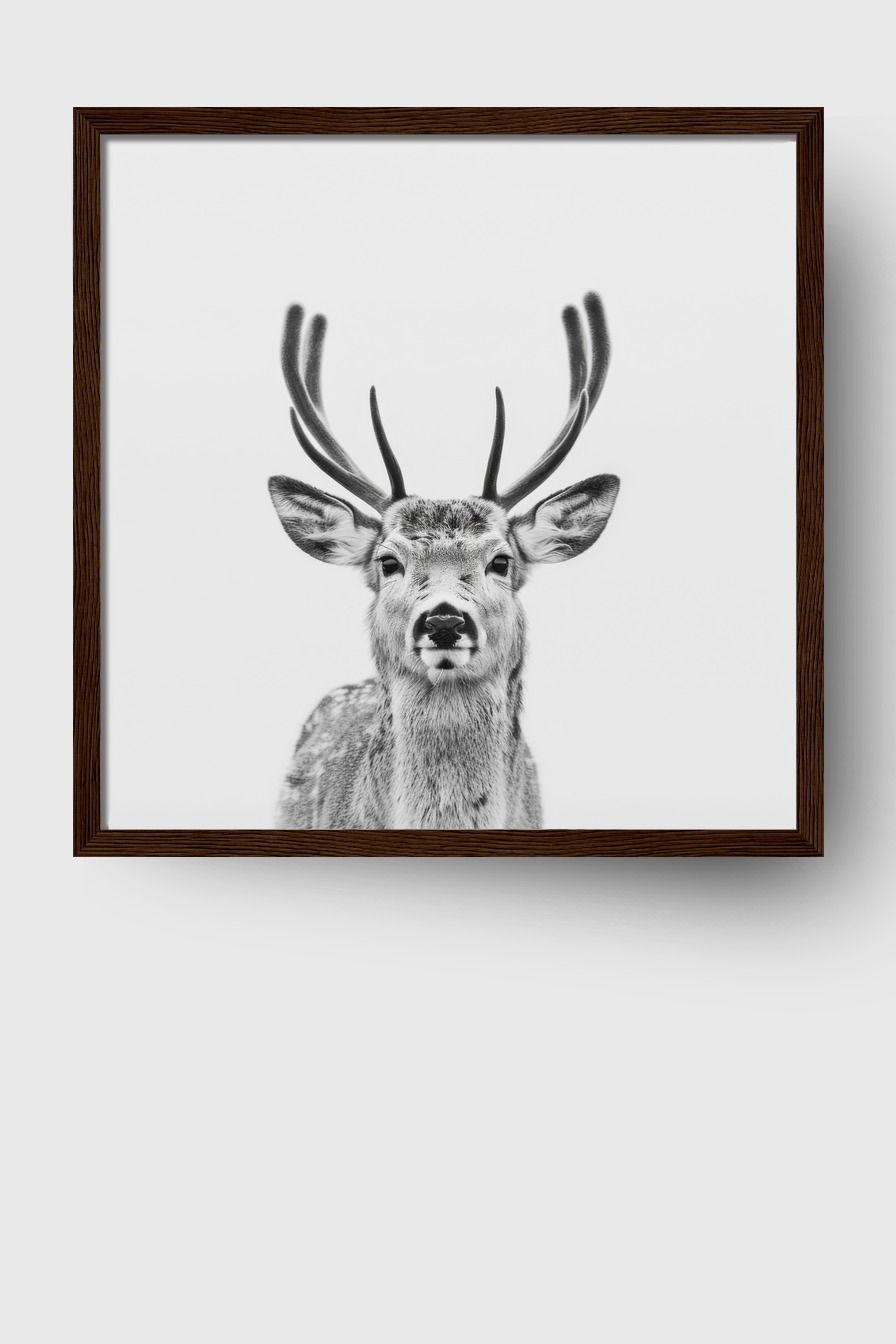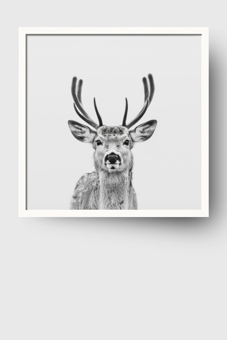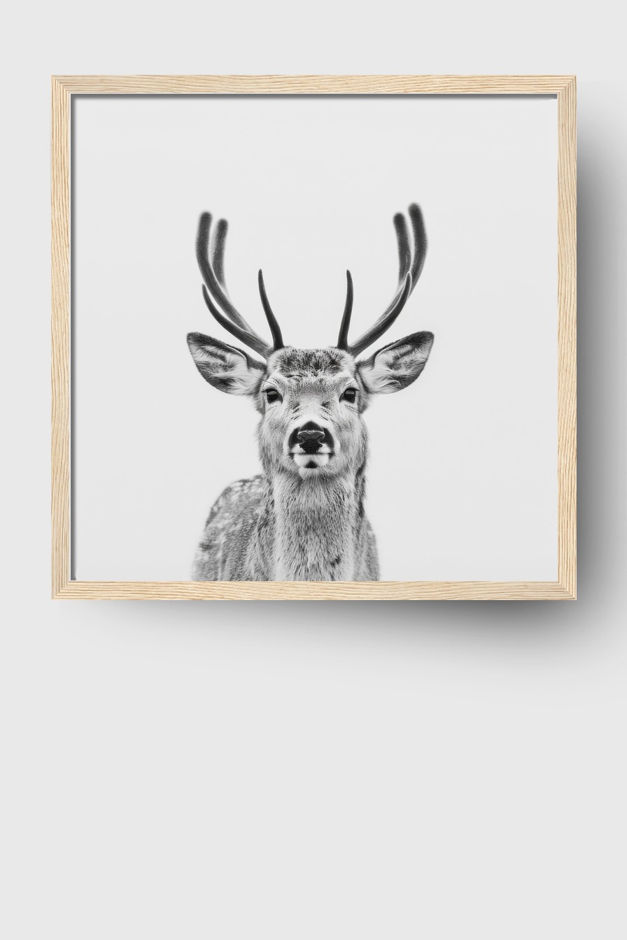 Im Raum wirkt das Bild durch den klaren Kontrast und den präzisen Fokus auf das samtige Geweih sehr präsent.
