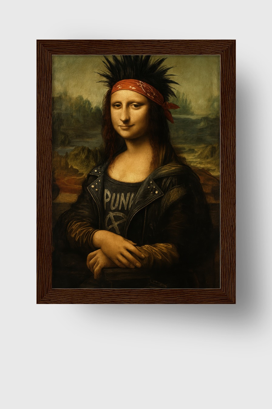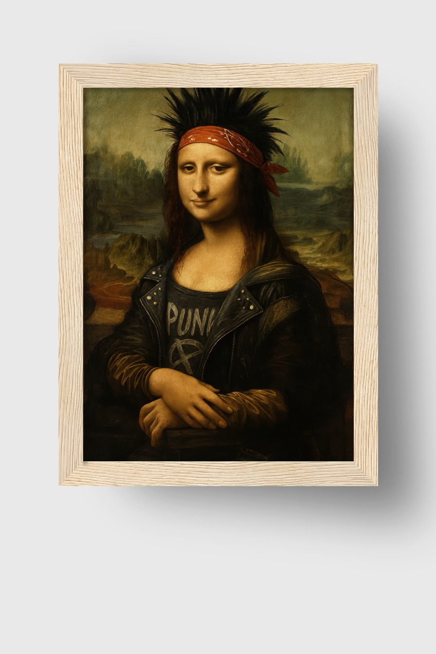Die Mona Lisa zeigt sich im Punkstil mit Lederjacke und Haarband. Das Poster liegt hinter bruchsicherem Plexiglas in einem FSC-Kiefernholzrahmen. Erhältlich in Schwarz, Weiß, Naturholz und Dunkelbraun, fertig zum Aufhängen.