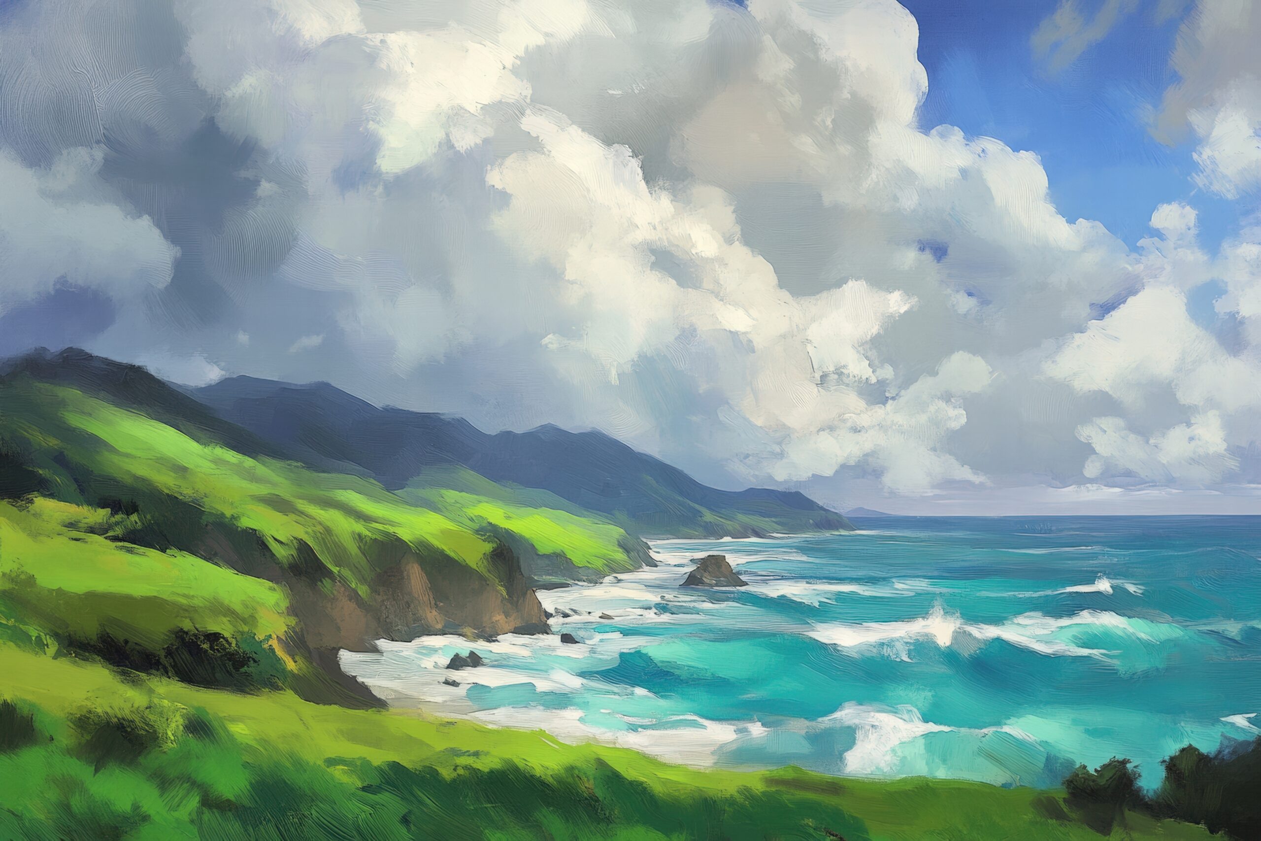 Eine malerische Küstenlandschaft mit leuchtend grünen Hügeln und türkisfarbenem Meer. Dramatische Wolken dominieren den Himmel und verstärken die natürliche Stimmung.