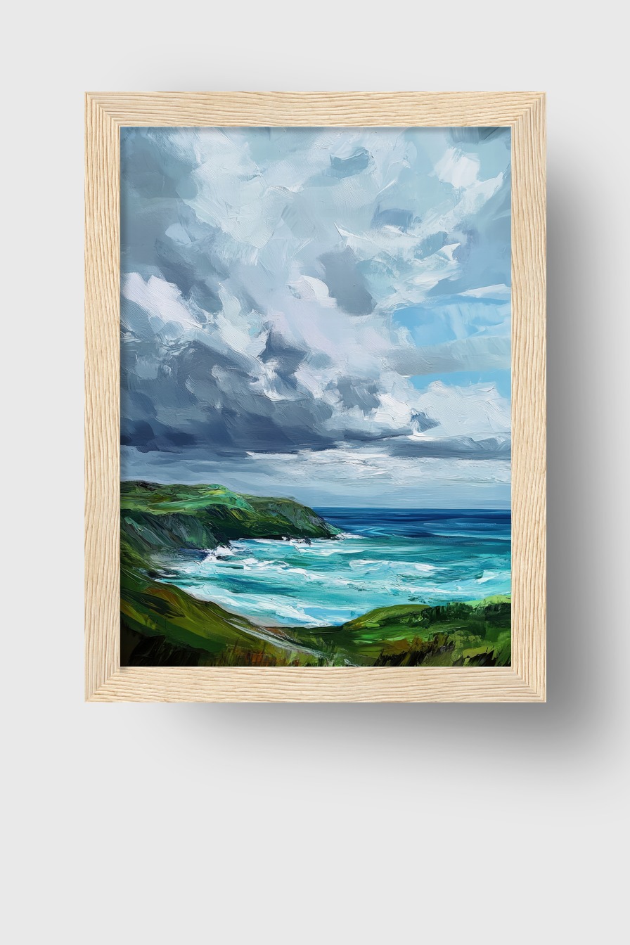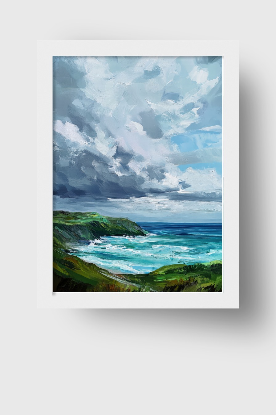 Diese Malerei zeigt eine lebendige Küstenlandschaft mit stürmischen Wolken. Die kräftigen Pinselstriche fangen die dynamische Stimmung zwischen Land und Meer ein.