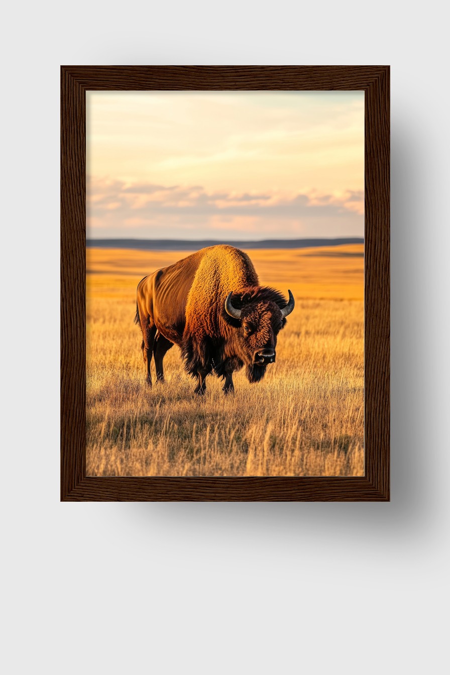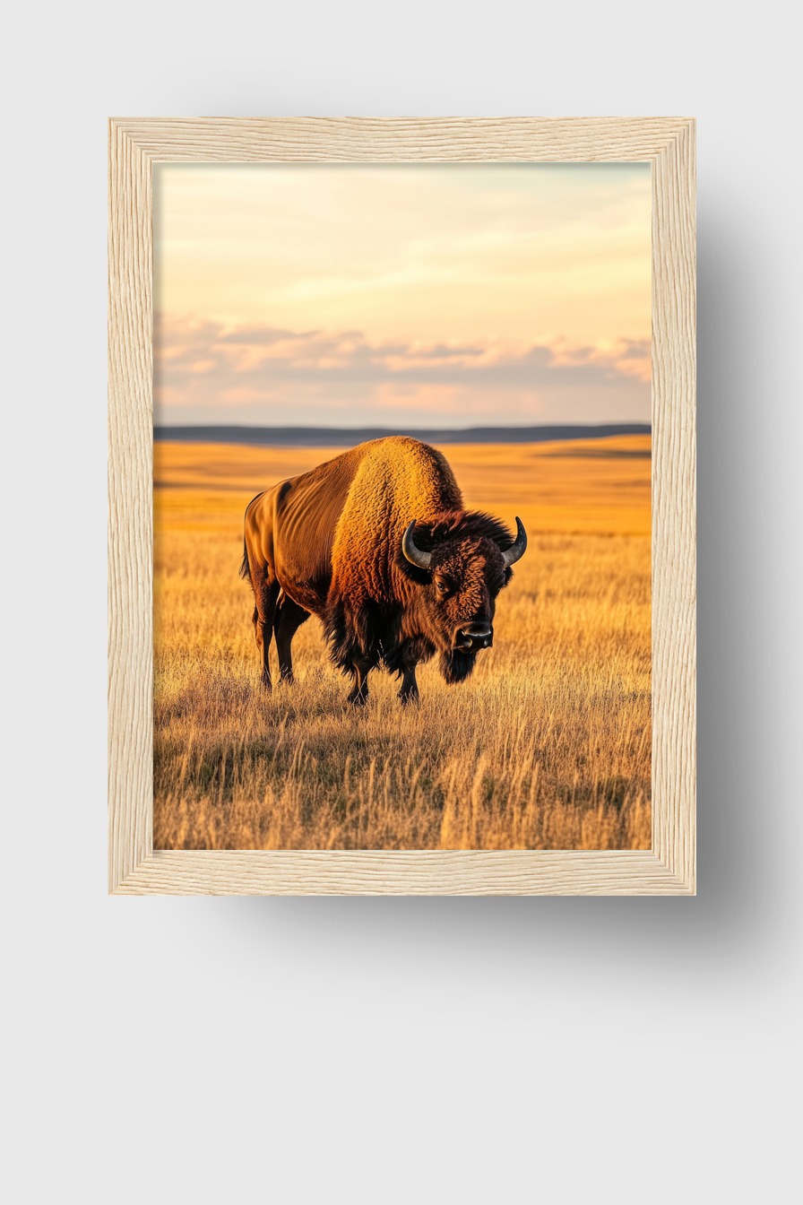 Dieses Bild zeigt einen Bison, der auf einer weiten Grasfläche steht. Das warme Sonnenlicht hebt die Details des Tieres und der Landschaft hervor.