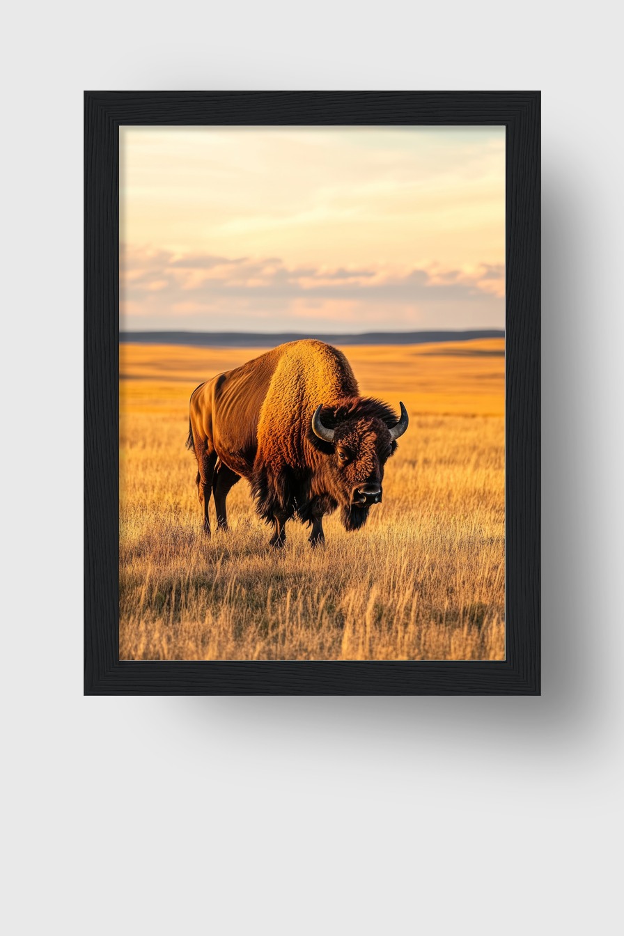 Poster mit einem Bison auf der Prärie im warmen Sonnenlicht, natürlicher Wildtier-Kunstdruck in erdigen Farbtönen