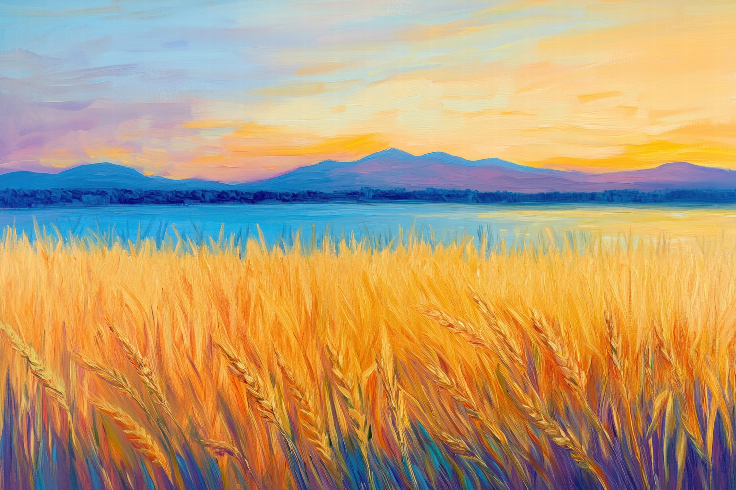 Dieses Motiv zeigt ein leuchtendes Weizenfeld vor einem ruhigen See mit Bergen am Horizont. Die warmen Farben des Sonnenuntergangs schaffen eine friedliche Stimmung.