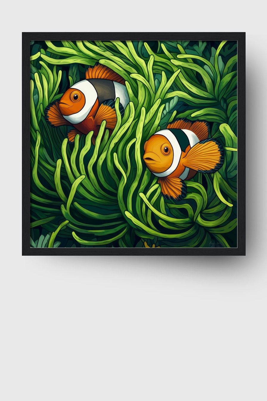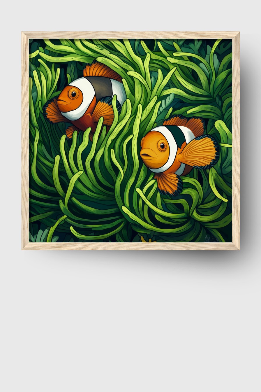 Dieses Motiv zeigt zwei lebendige Clownfische, eingebettet in grünes Seegras. Die kräftigen Farben und Details verleihen dem Bild eine natürliche, frische Ausstrahlung.