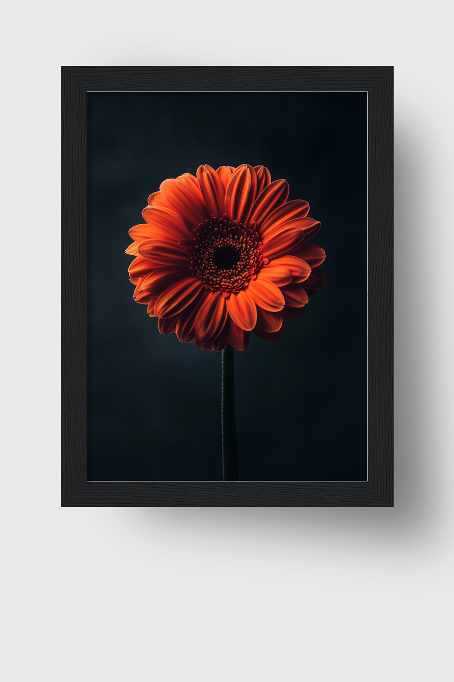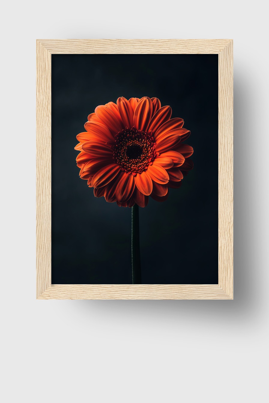 Eine orange Gerbera auf halbmattem 170 g/m² FSC-Papier mit bruchsicherem Plexiglas hinterlegt. Der Kiefernholzrahmen ist in Schwarz, Weiß, Naturholz und Dunkelbraun verfügbar. Fertig zum Aufhängen, inklusive Aufhängeset.