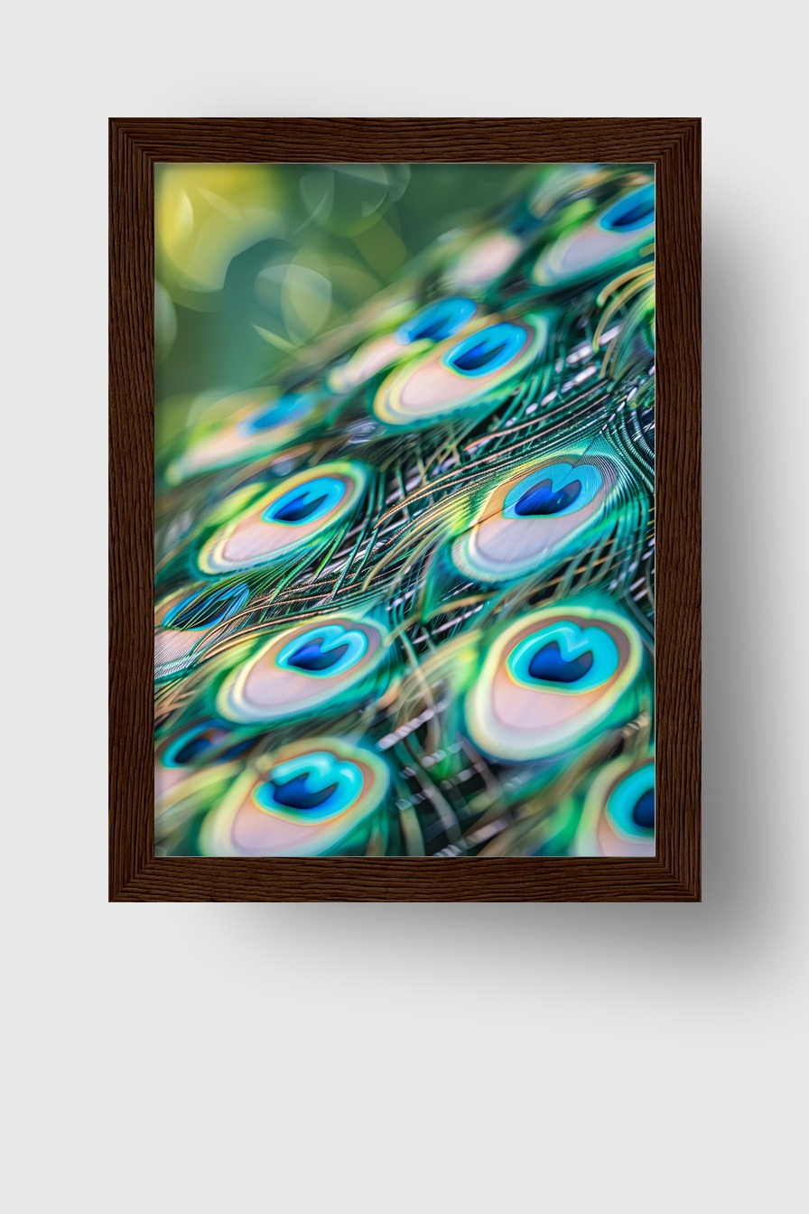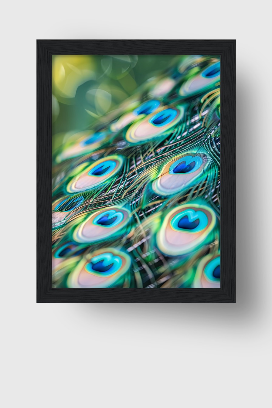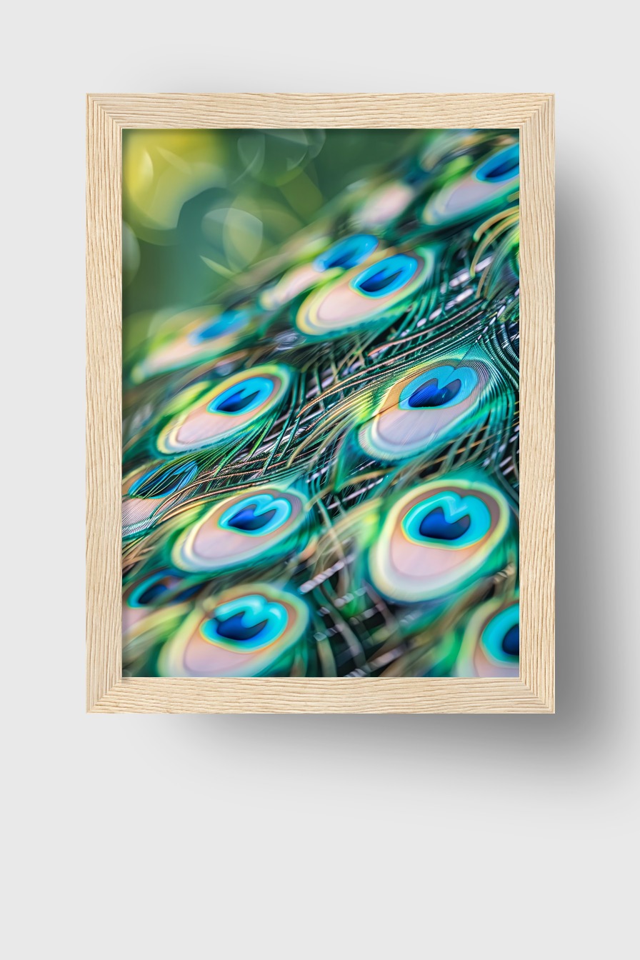 Pfauenfedern auf halbmattem Poster (170 g/m²) hinter bruchsicherem Plexiglas. Eingefasst in einen FSC-zertifizierten Kiefernholzrahmen in Naturholz. Fertig zum Aufhängen inklusive Aufhängeset. Das Muster bleibt klar und lebendig.