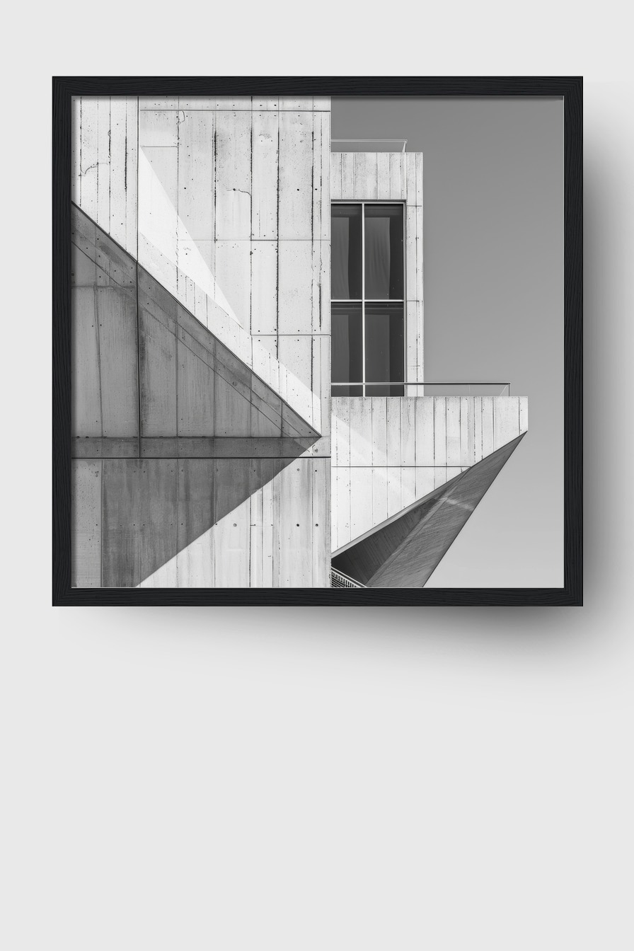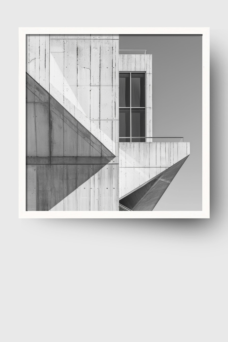 Schwarzweiß Poster einer modernen Betonfassade mit klaren Linien, Fenstern und geometrischen Formen, minimalistischer Stil