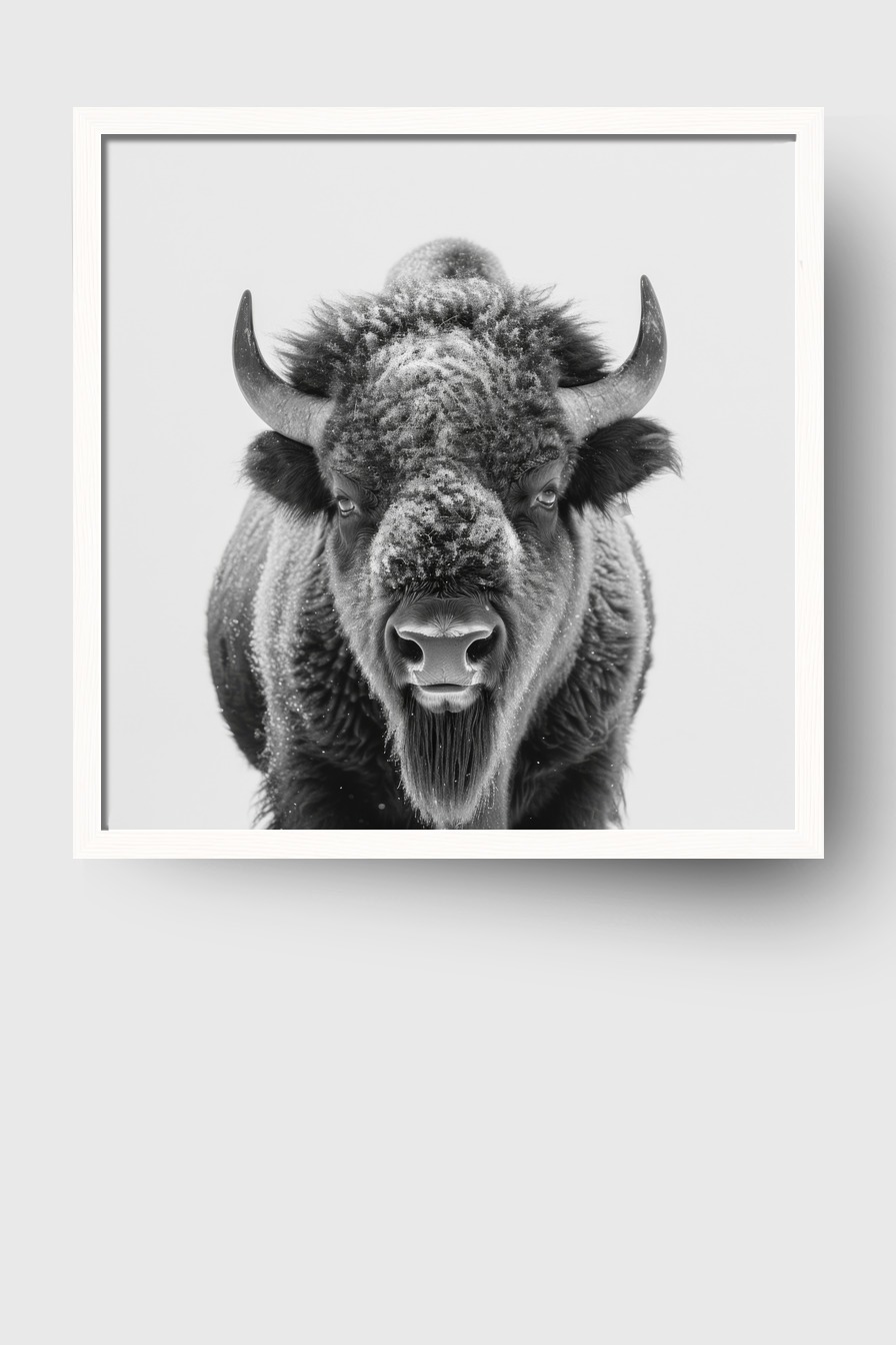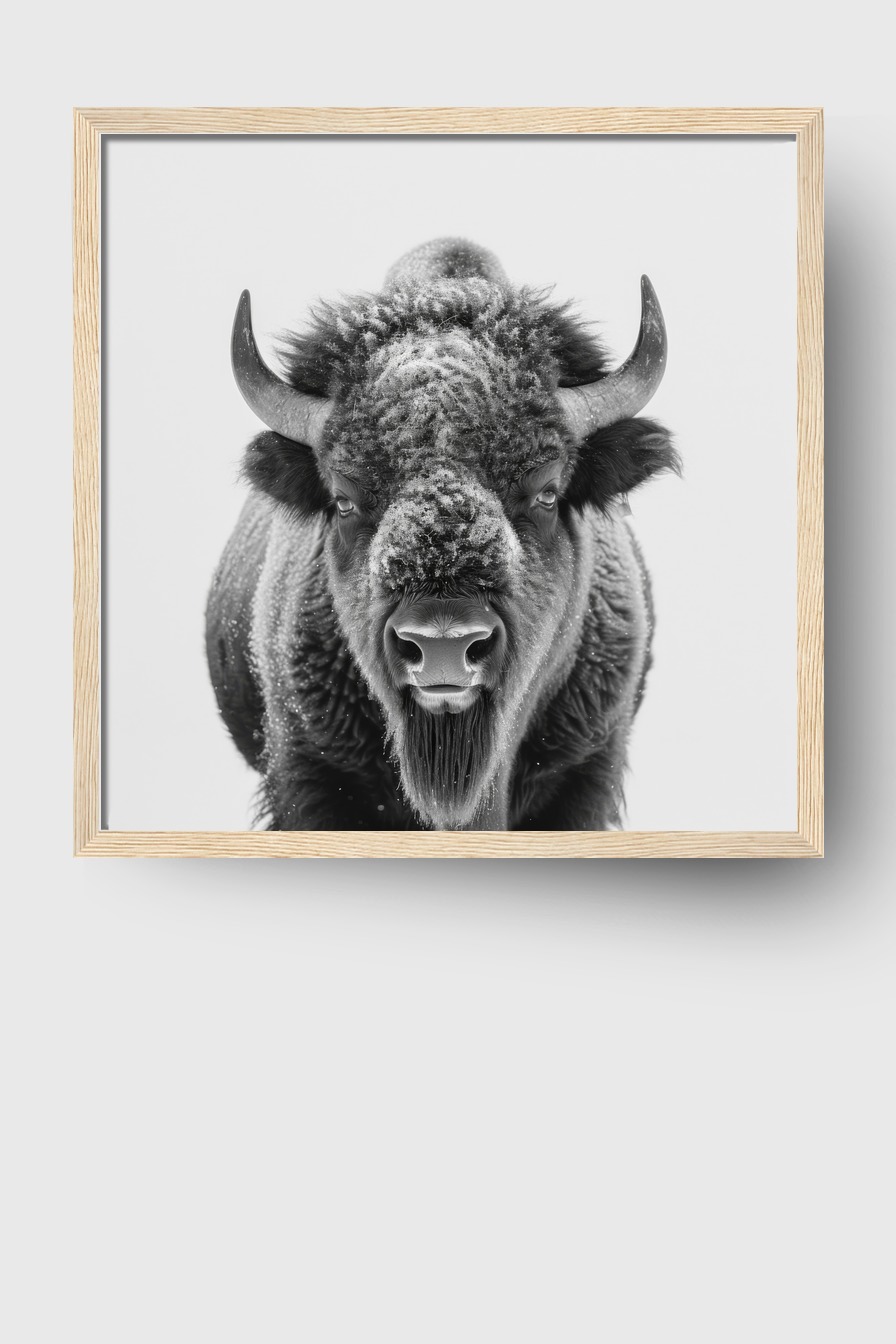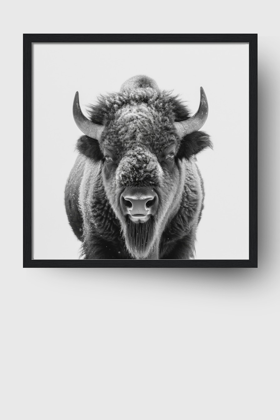 Dieses Schwarz-Weiß-Bild zeigt einen Bison im Schnee aus der Nahaufnahme. Das Fell des Bisons ist deutlich mit Schneekristallen bedeckt.