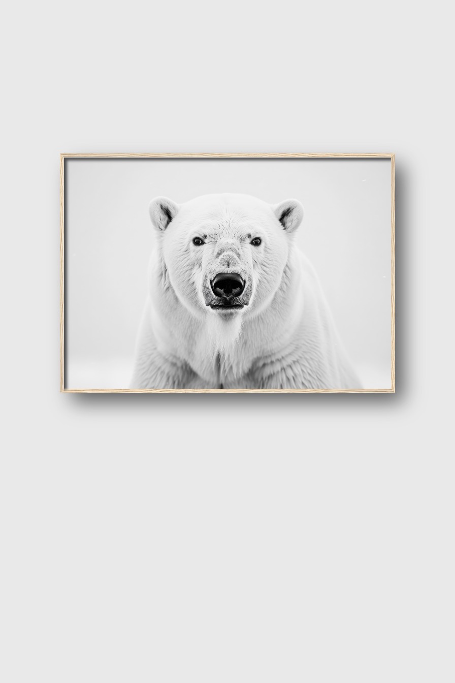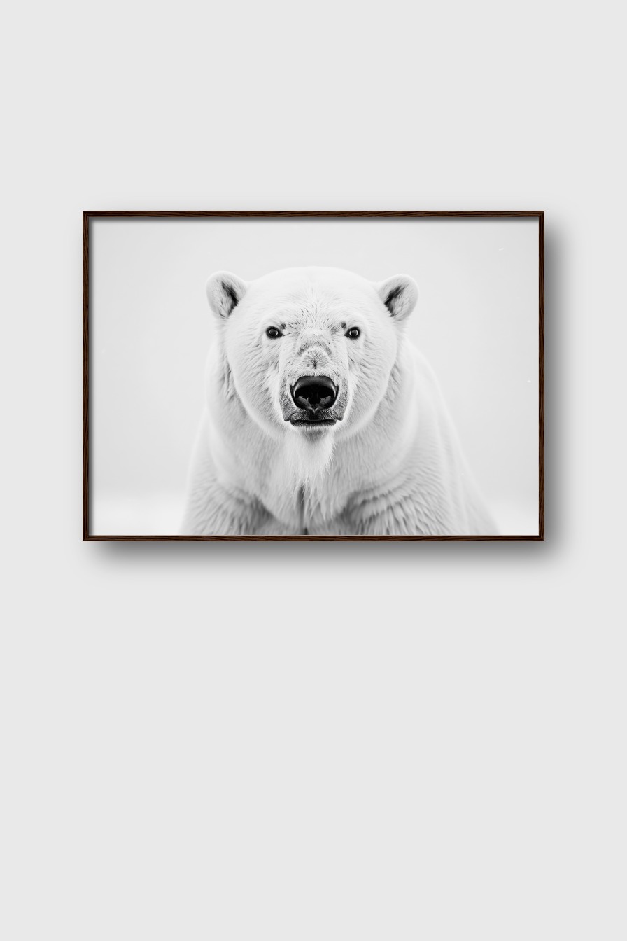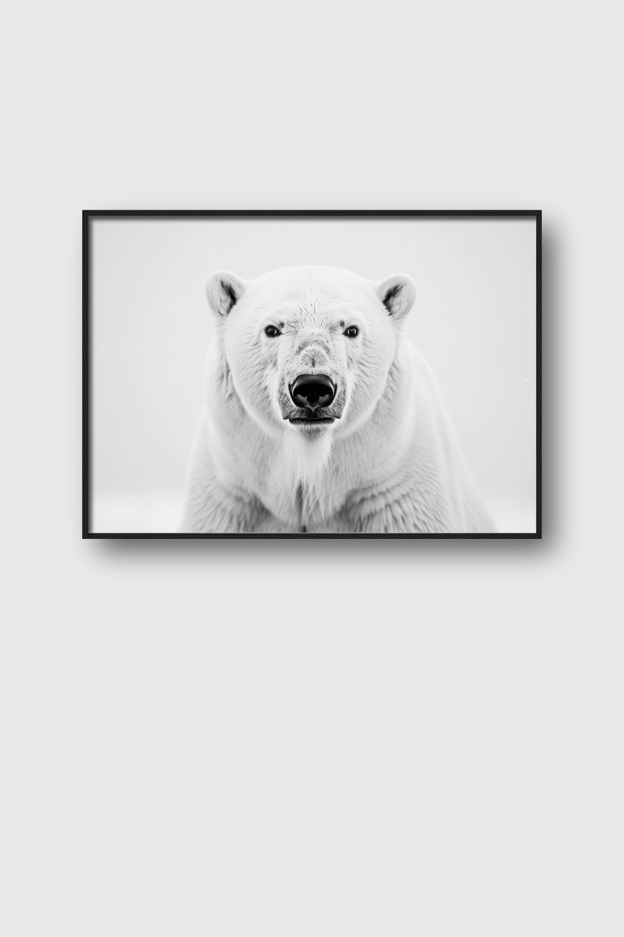 Der schwarze Rahmen betont die Tiefe des Blicks und verstärkt die kühle, klare Wirkung des weißen Fells. Daraus entsteht eine spannungsgeladene Szenerie, die im Raum eine fast greifbare Präsenz zeigt.