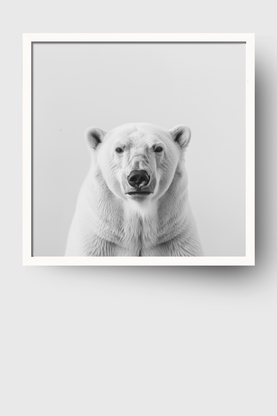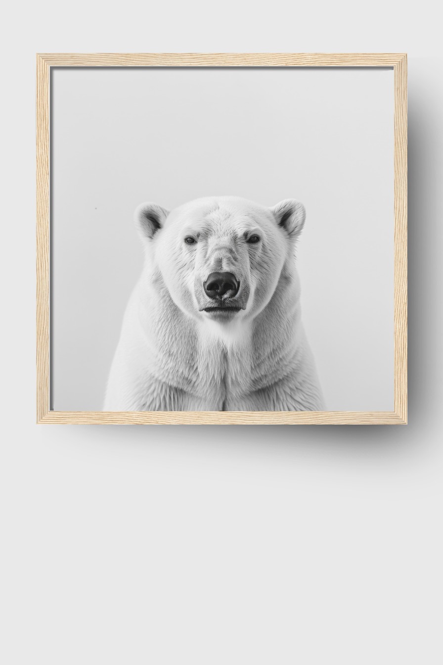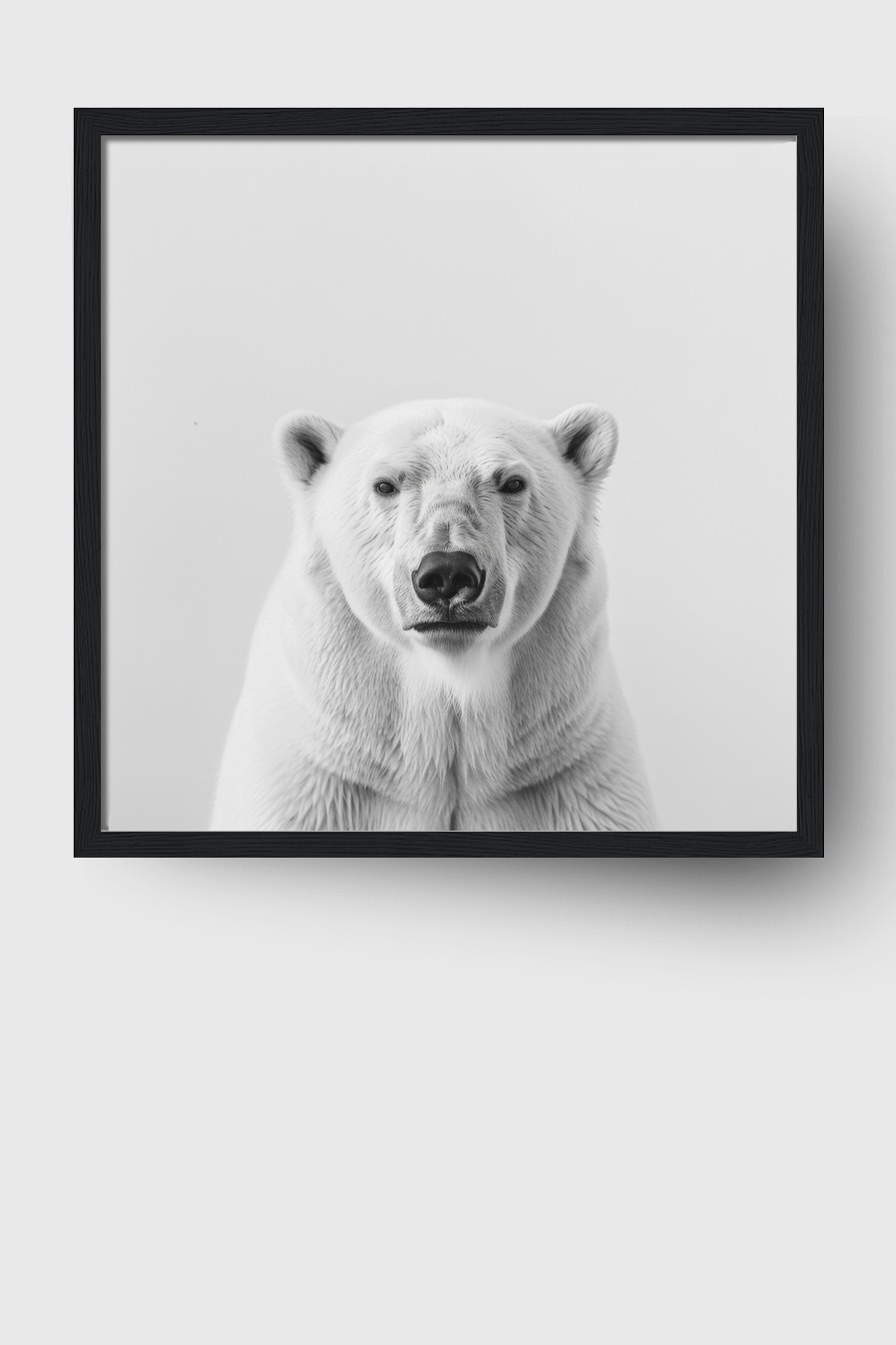 Im Raum wirkt das Bild durch die konzentrierte Komposition intensiv und zieht die Aufmerksamkeit auf die ruhige, wachsame Präsenz des Eisbären.