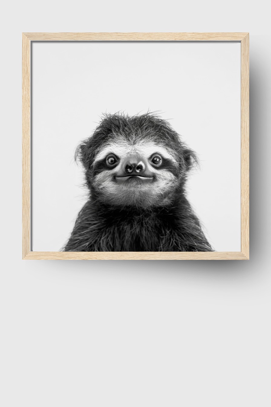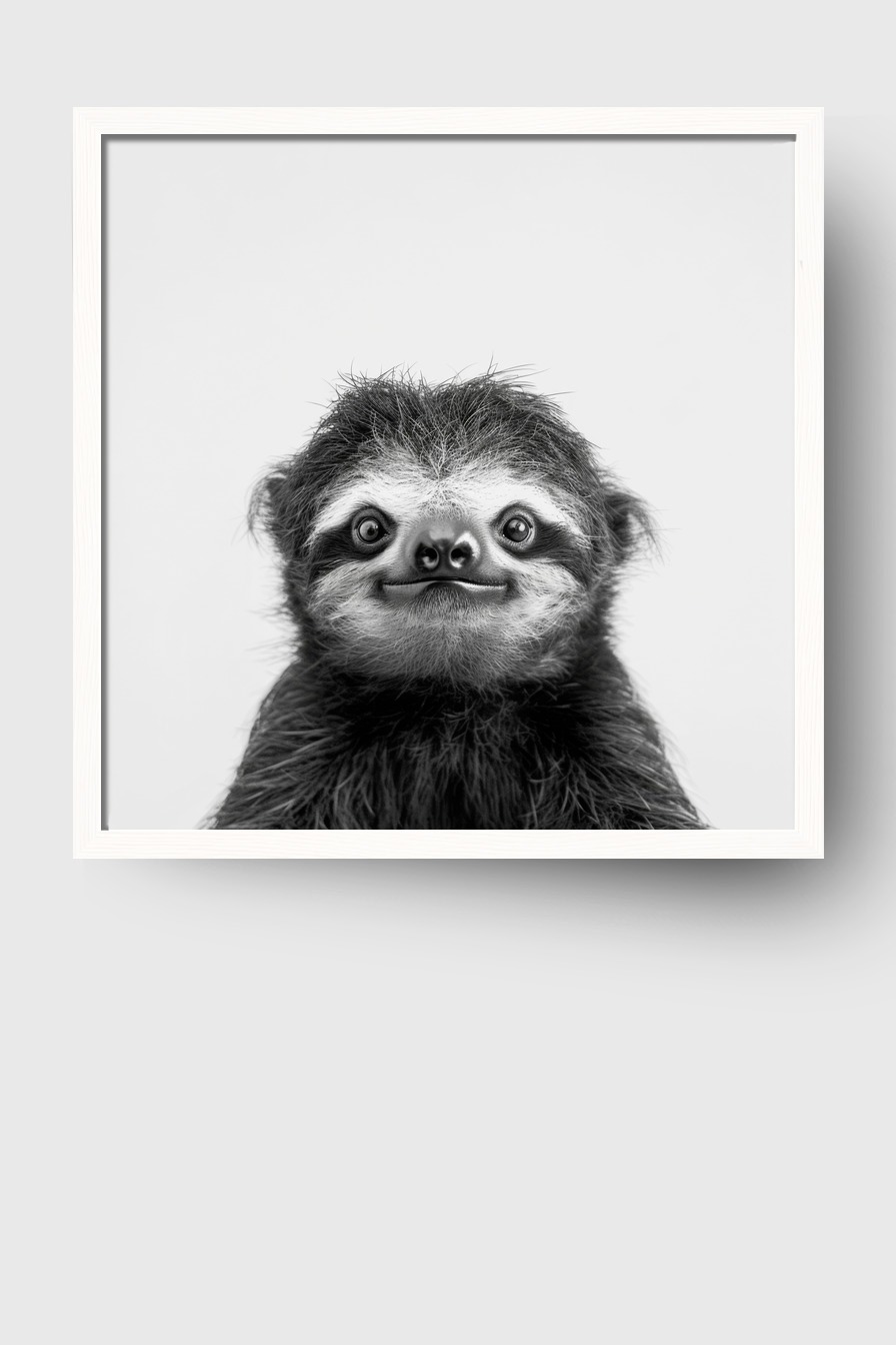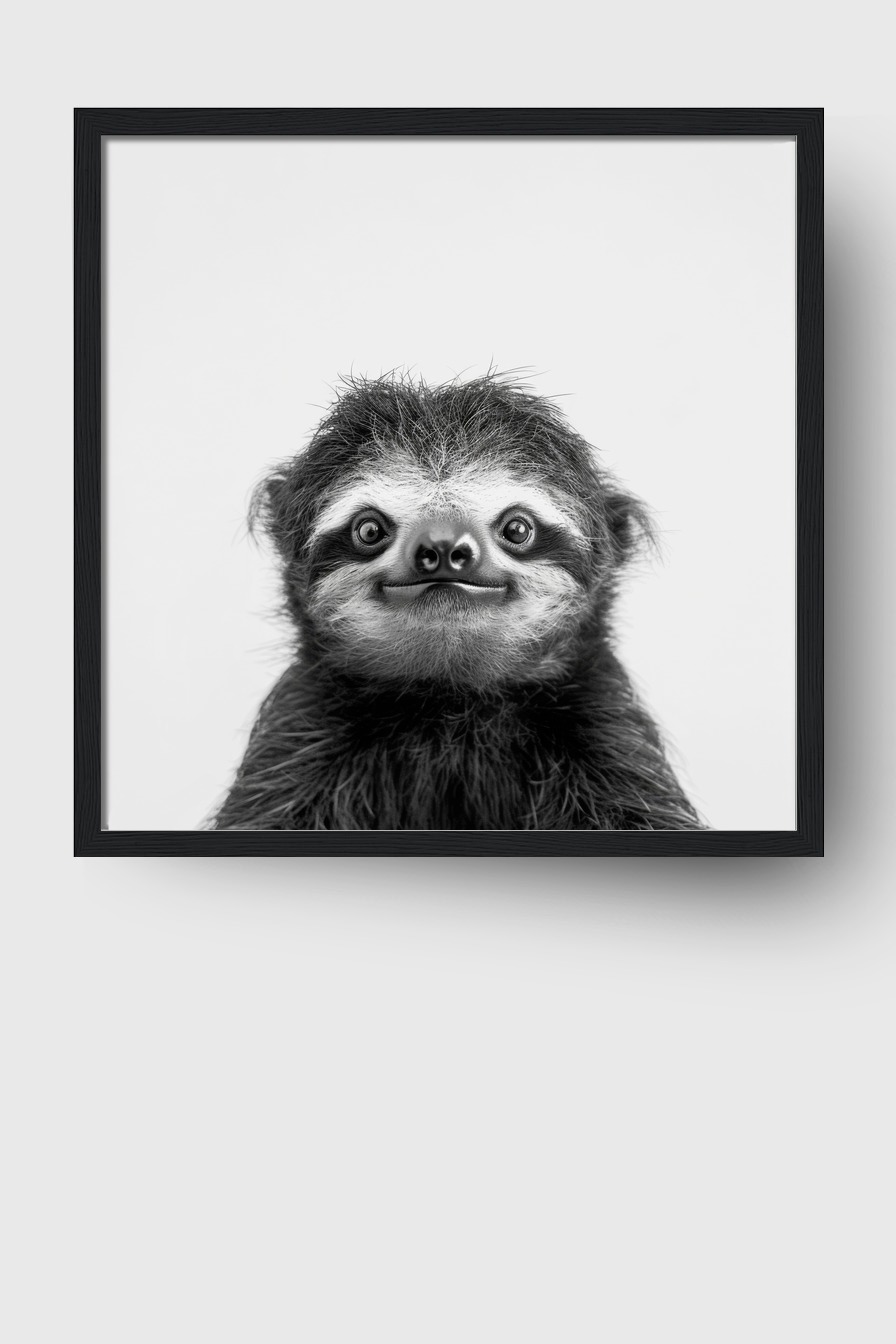 Das Motiv wirkt ruhig und klar durch den weißen Hintergrund und die zentrale Platzierung des Faultiers.