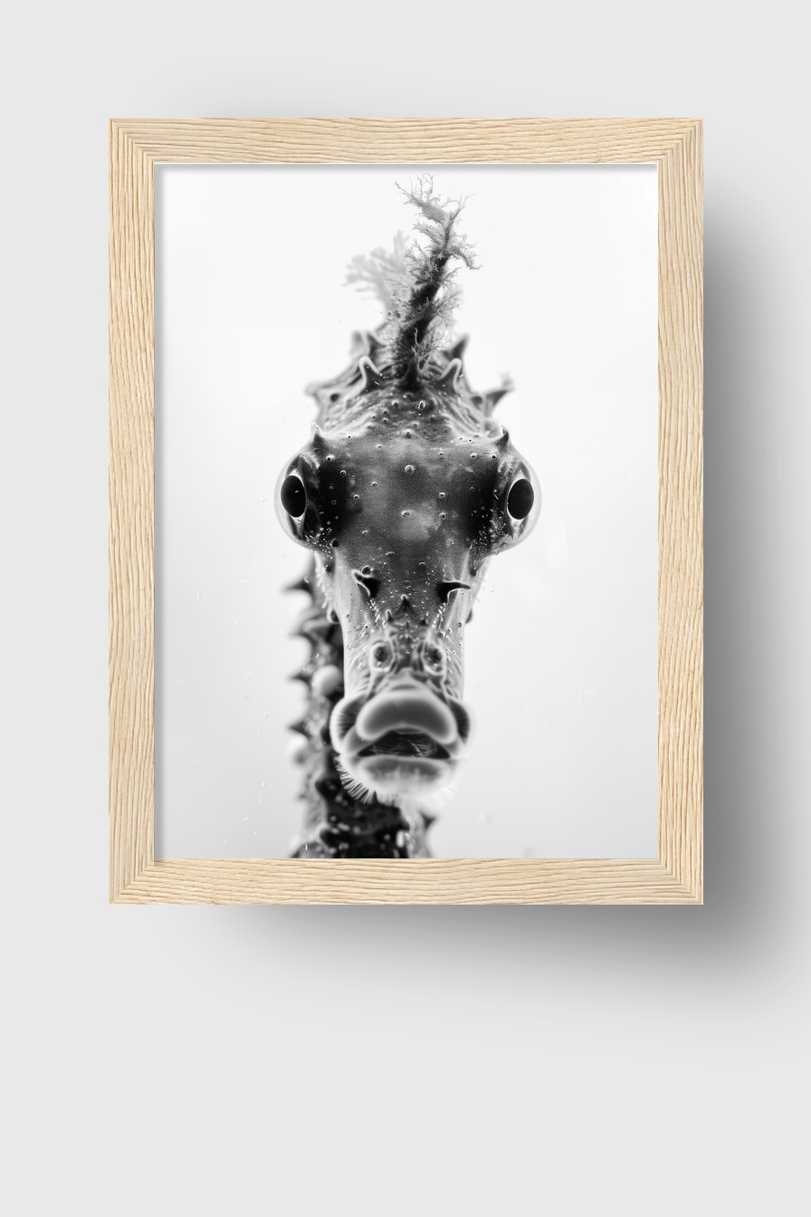 Markante Konturen und Muster eines Seepferdchens auf hellem Hintergrund, prägnanter Fokus auf das Gesicht