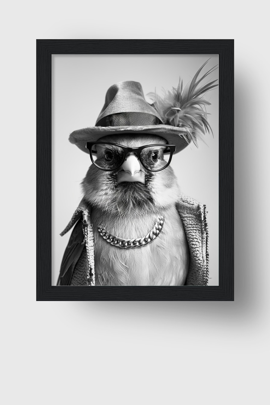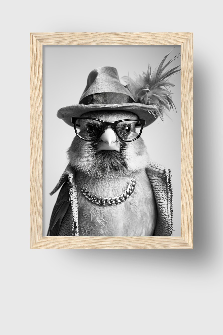 Vogelportrait mit Hut und Brille als Poster (170 g/m², halbmatt) hinter bruchsicherem Plexiglas im Kiefernholzrahmen (FSC). Fertig zum Aufhängen inklusive Set.