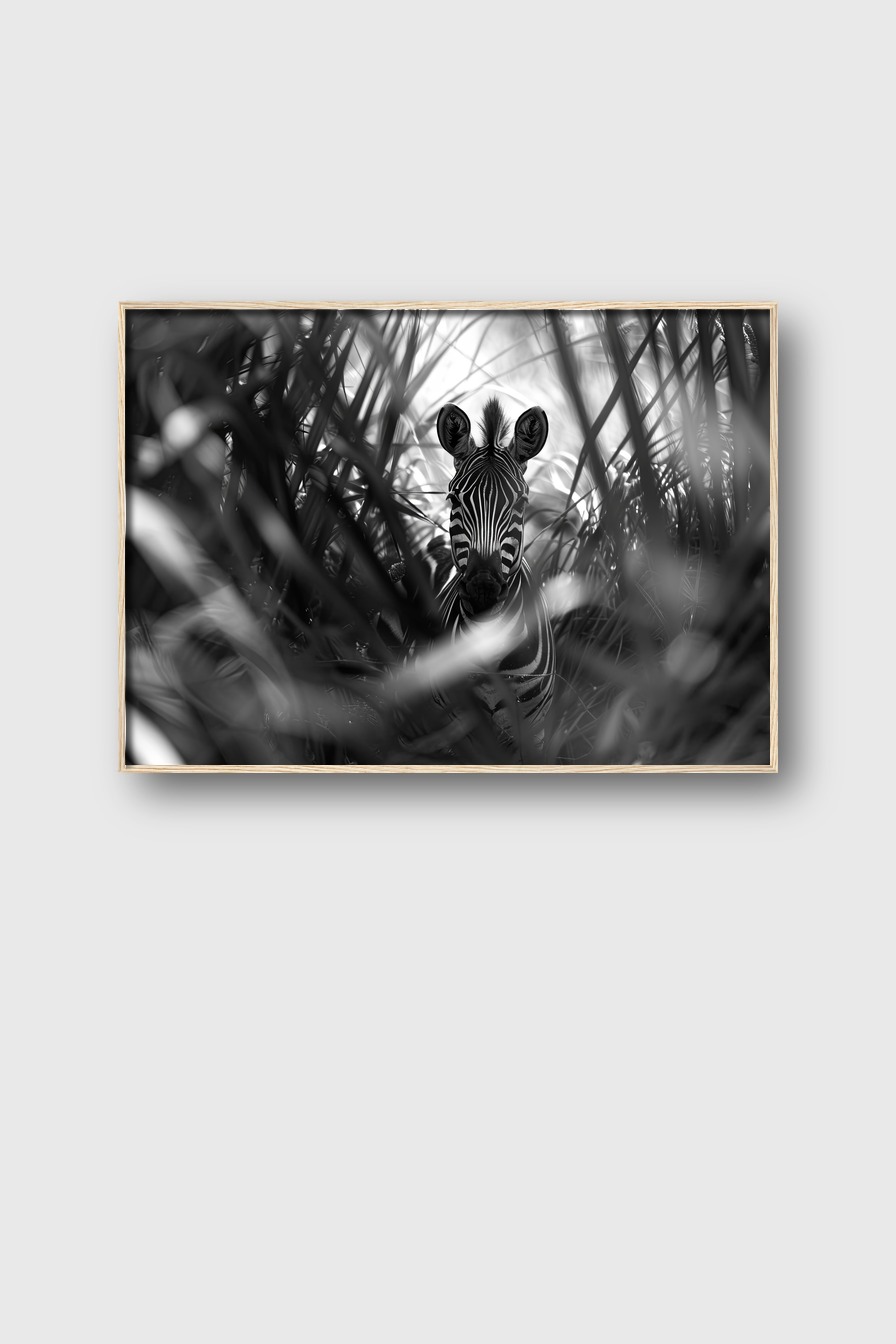 Mit seiner ruhigen Präsenz wirkt das Zebra im Raum aufmerksam und zieht den Blick magisch in die natürliche Umgebung zwischen den Gräsern.