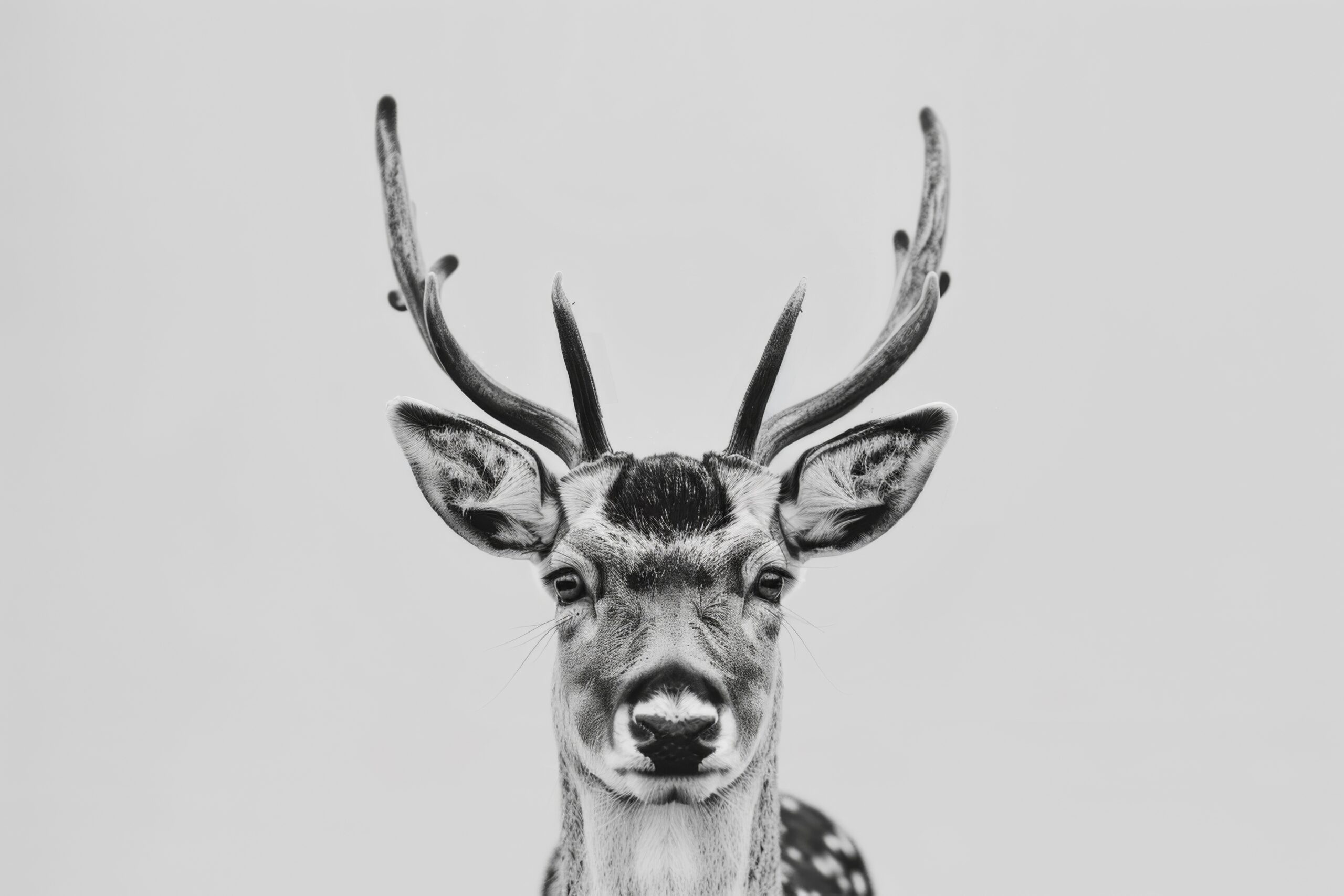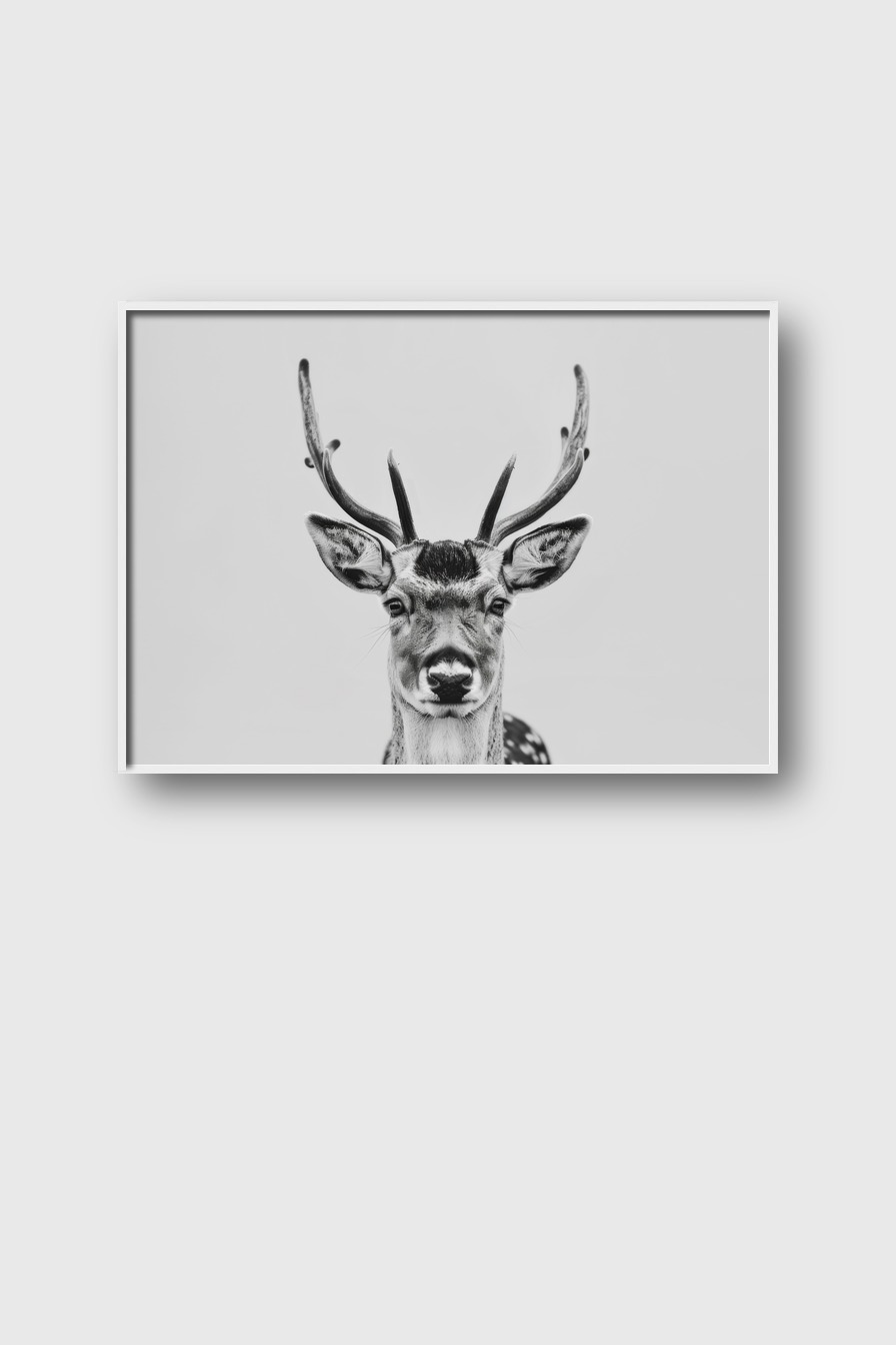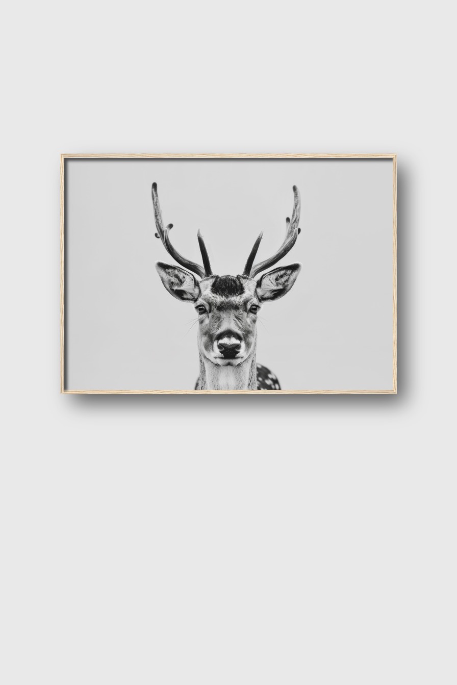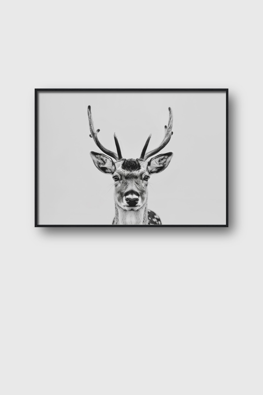Das Schwarz-Weiß-Motiv hebt den Kontrast im Geweih und den Gesichtszügen hervor und wirkt dekorativ im Raum.