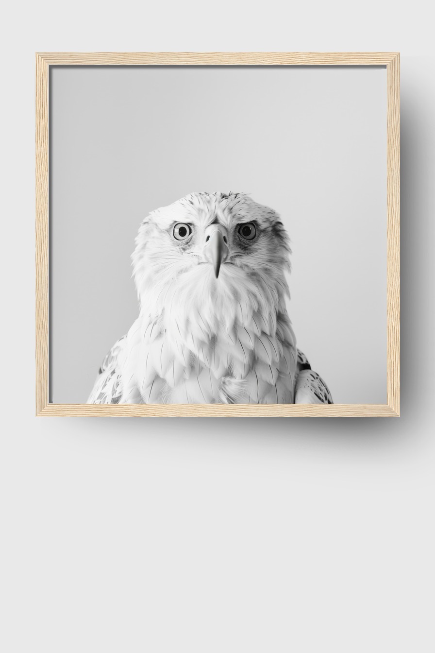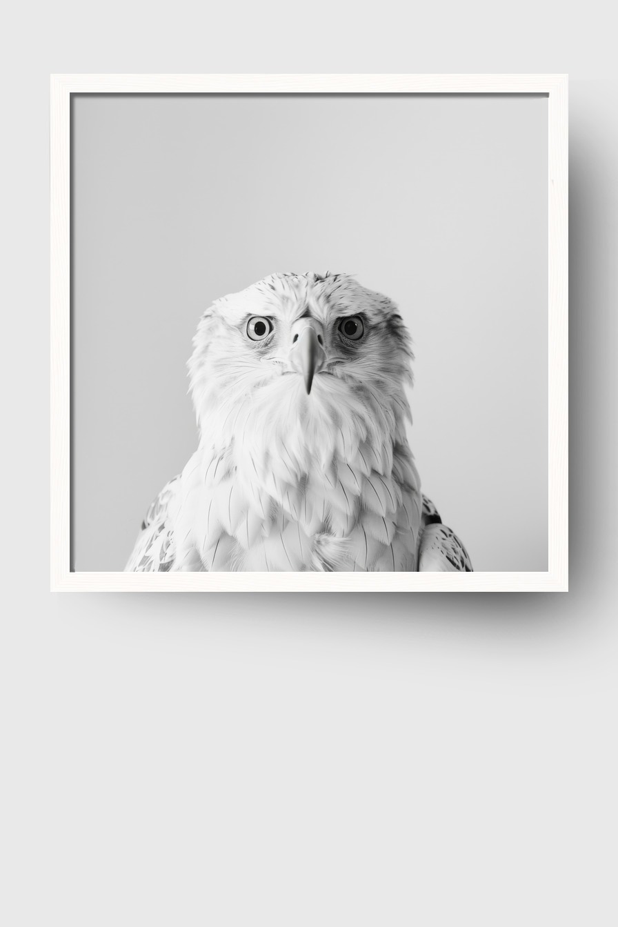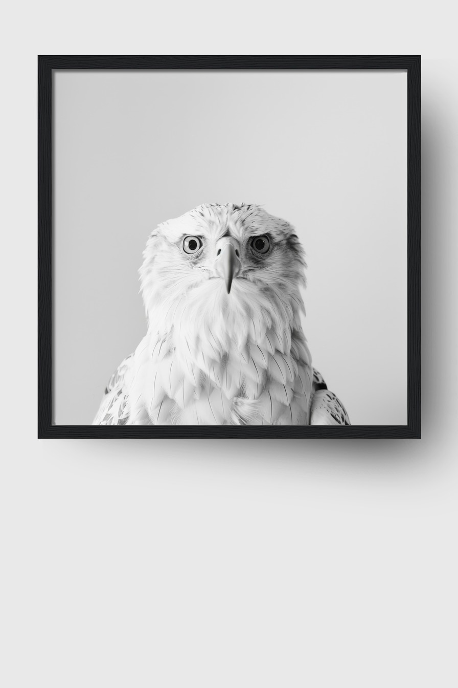 Der Falke wirkt ruhig und konzentriert, seine Details und die monochrome Gestaltung füllen den Raum mit einer klaren, fokussierten Atmosphäre.