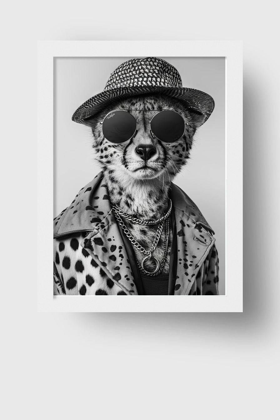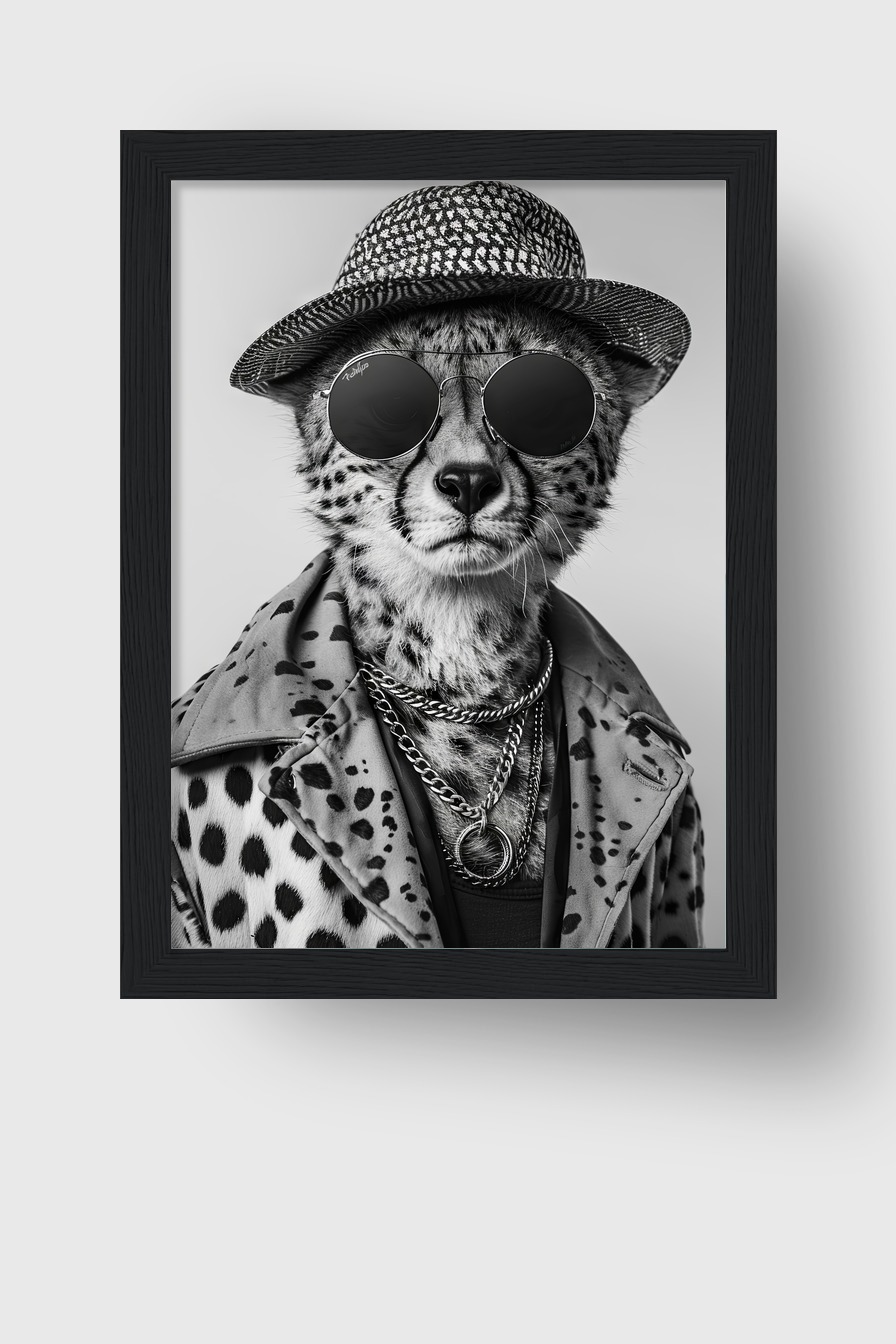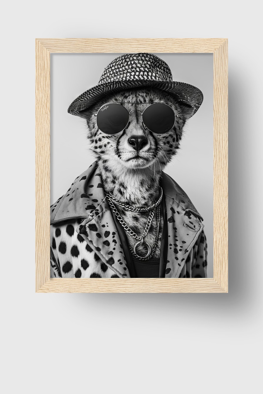 Gepard in Sonnenbrille und Hut, Poster auf 170 g/m² halbmatter FSC-Papier hinter bruchsicherem Plexiglas in Kiefernholzrahmen. Rahmenfarben in Schwarz, Weiß, Naturholz und Dunkelbraun verfügbar. Fertig zum Aufhängen.