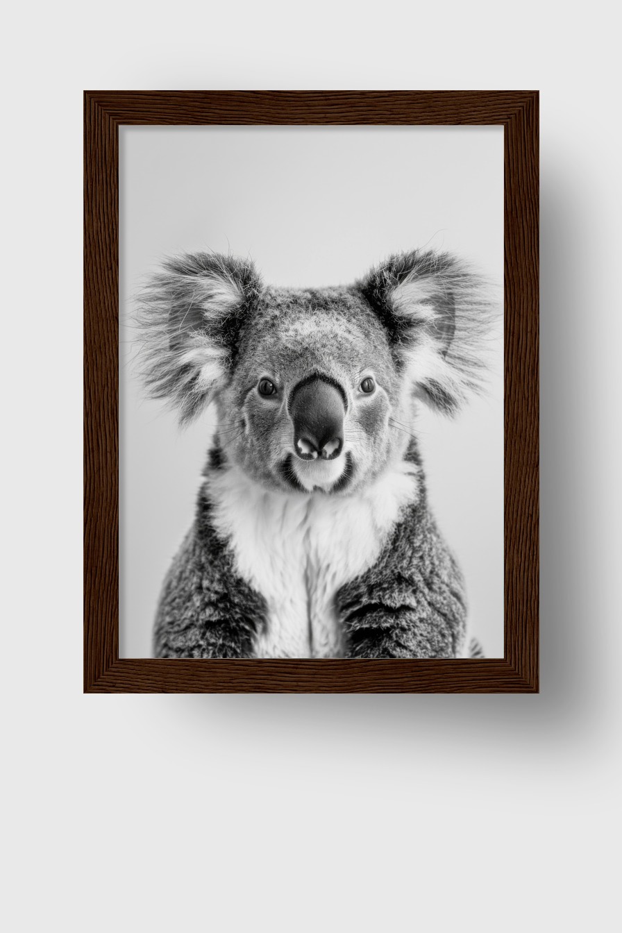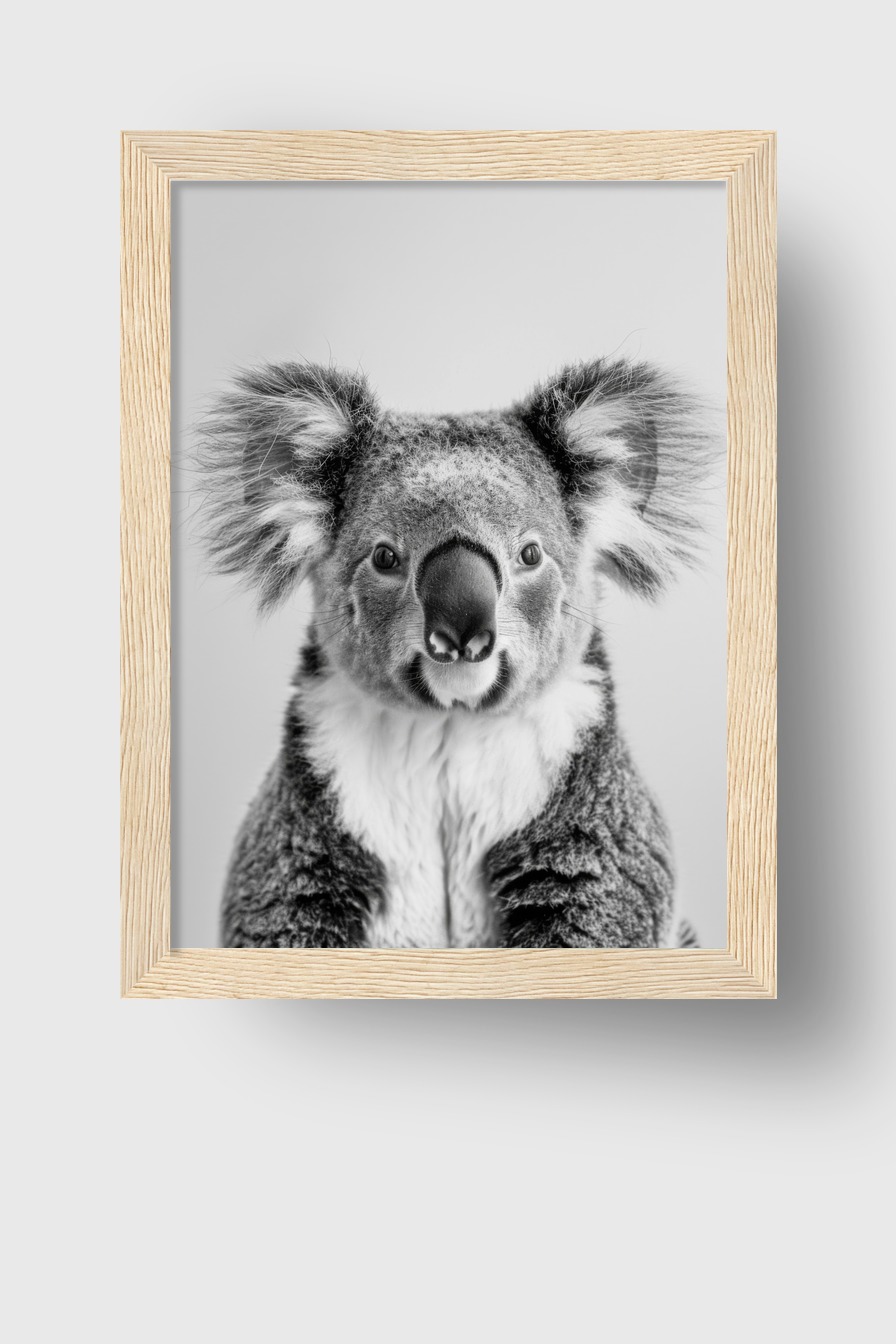 Im Raum setzt das Bild einen klaren Akzent durch die feine Differenzierung des Fells und die große Präsenz des Koalas. Die ruhige monochrome Gestaltung sorgt für eine moderne Eleganz, die jedes Zimmer bereichert.