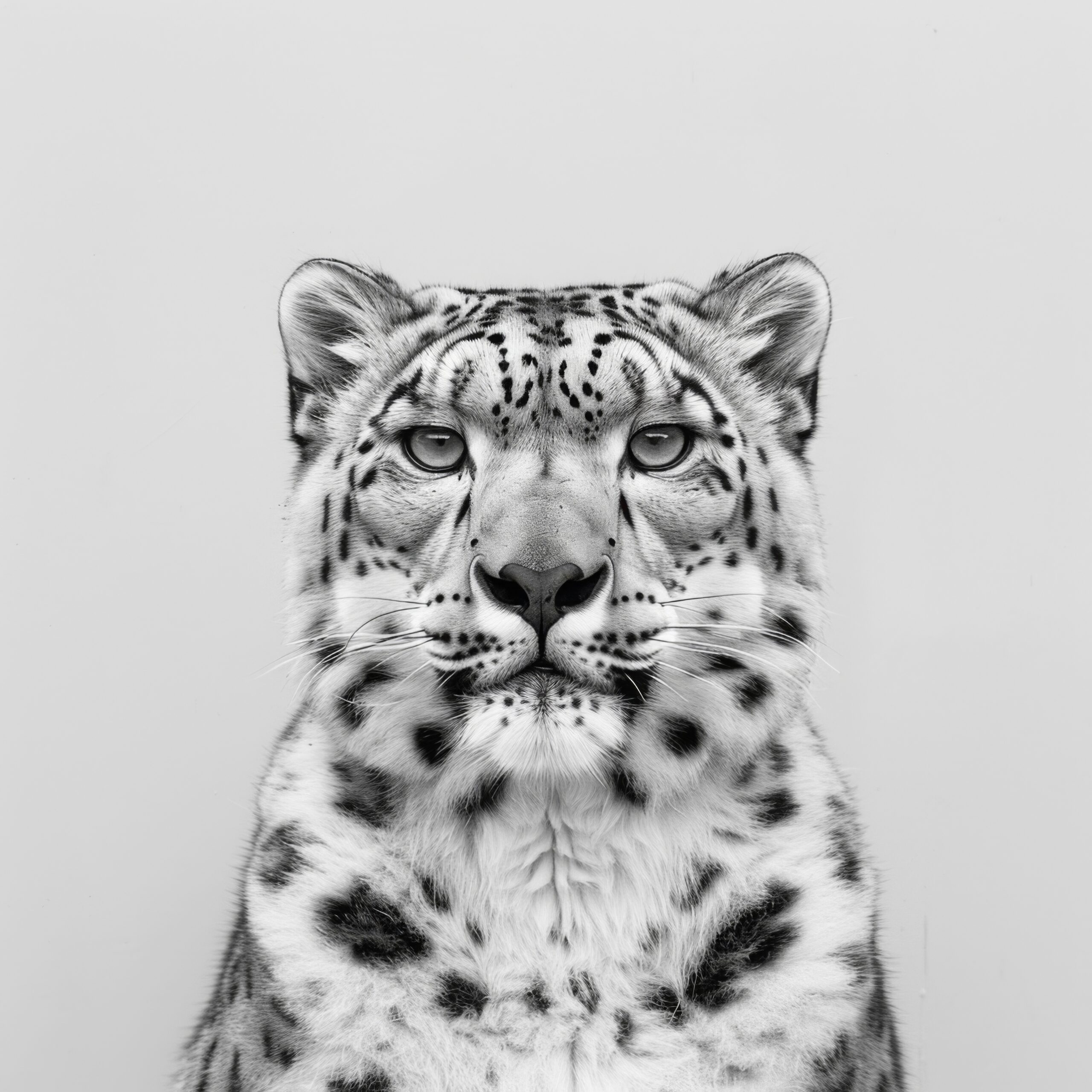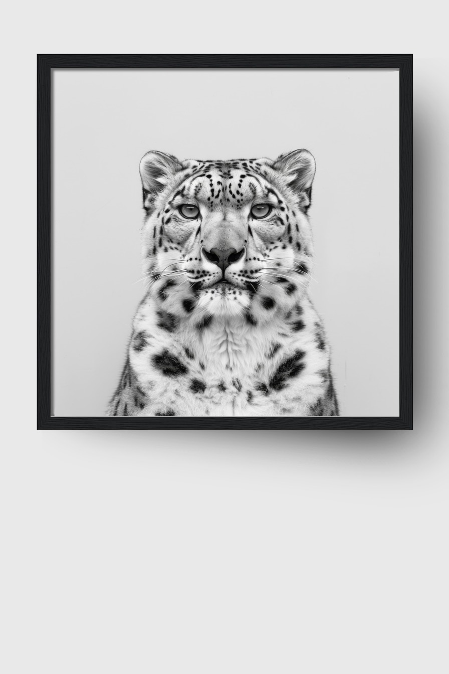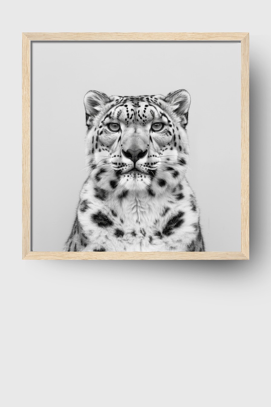 Das Porträt des Schneeleoparden zieht durch die ruhige Komposition im Raum alle Blicke auf sich.