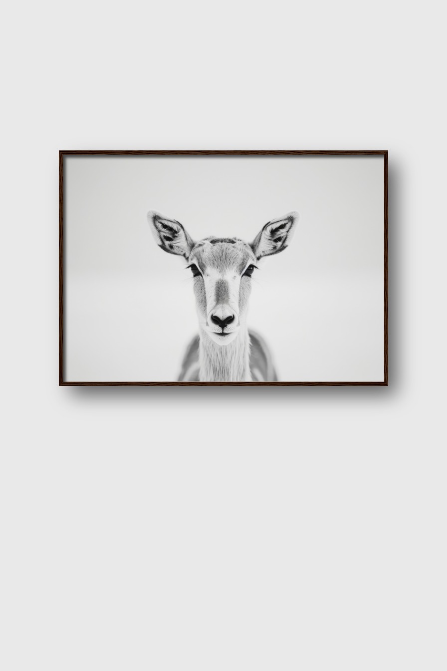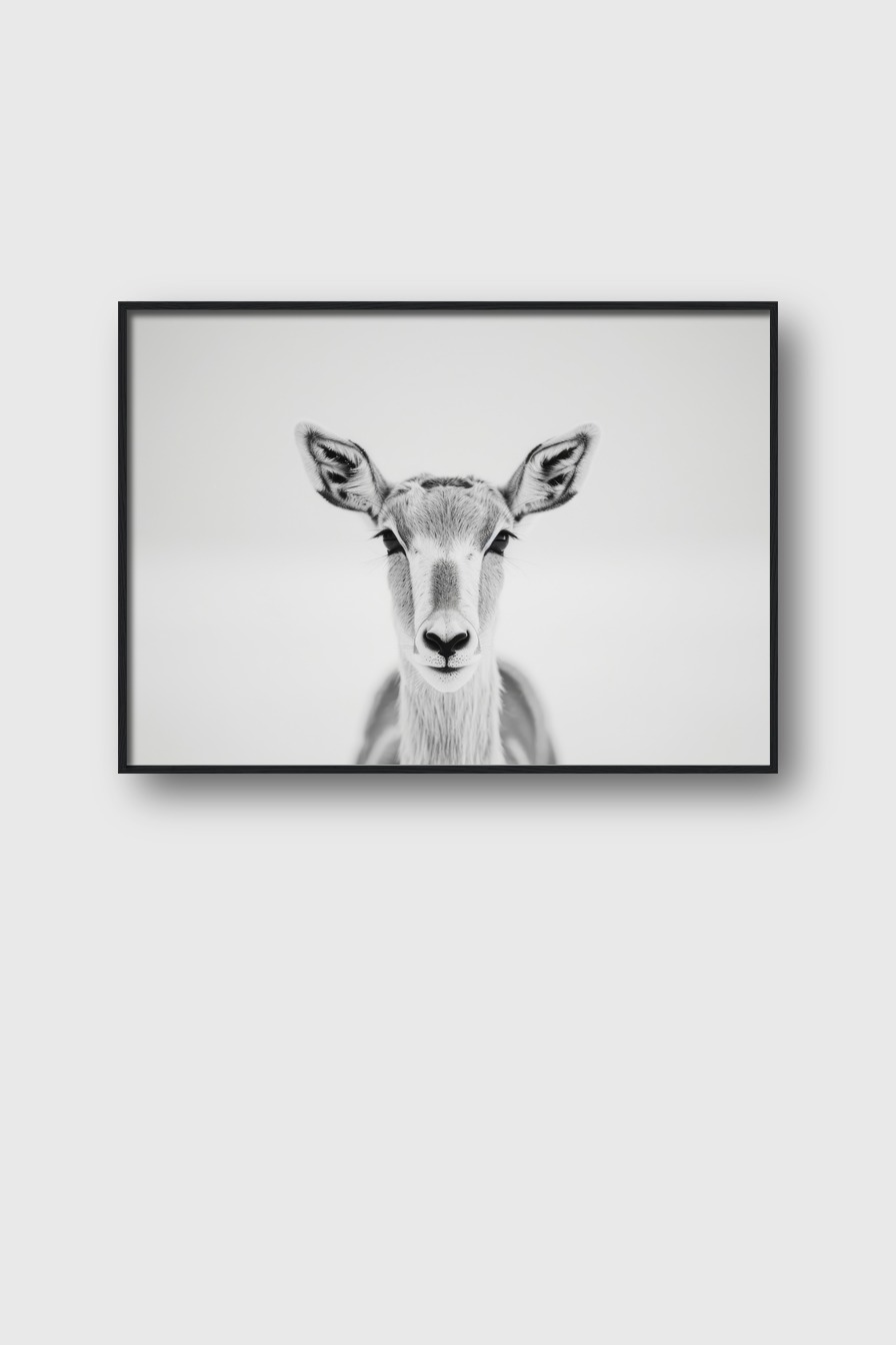 Das Bild zeigt eine Antilope frontal vor einem schlichten weißen Hintergrund. Die Schwarzweißaufnahme hebt die feinen Details und die ruhige Ausstrahlung des Tieres hervor.