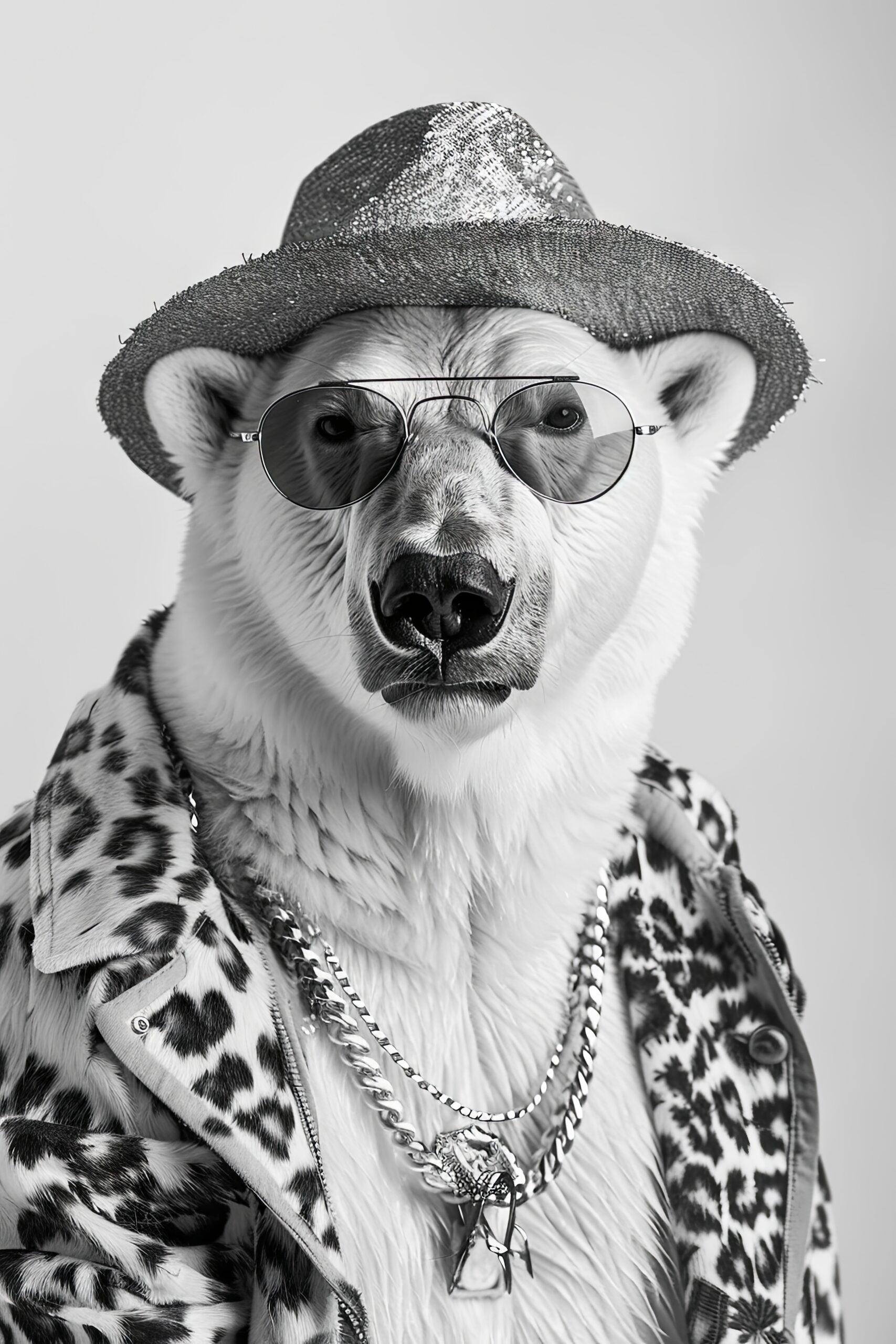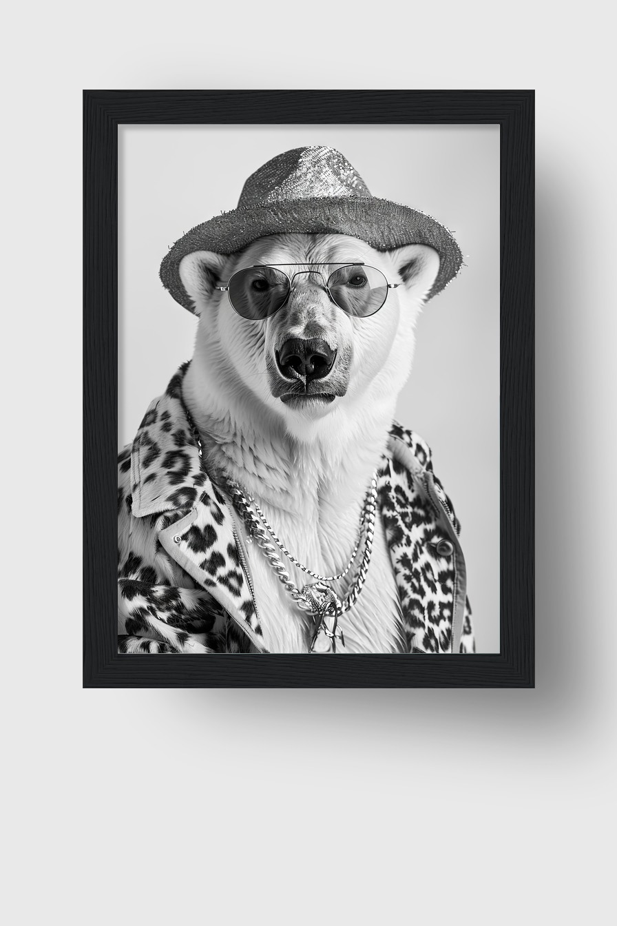 Fotografie Poster Eisbär Sonnenbrille Hut schwarz-weiß
