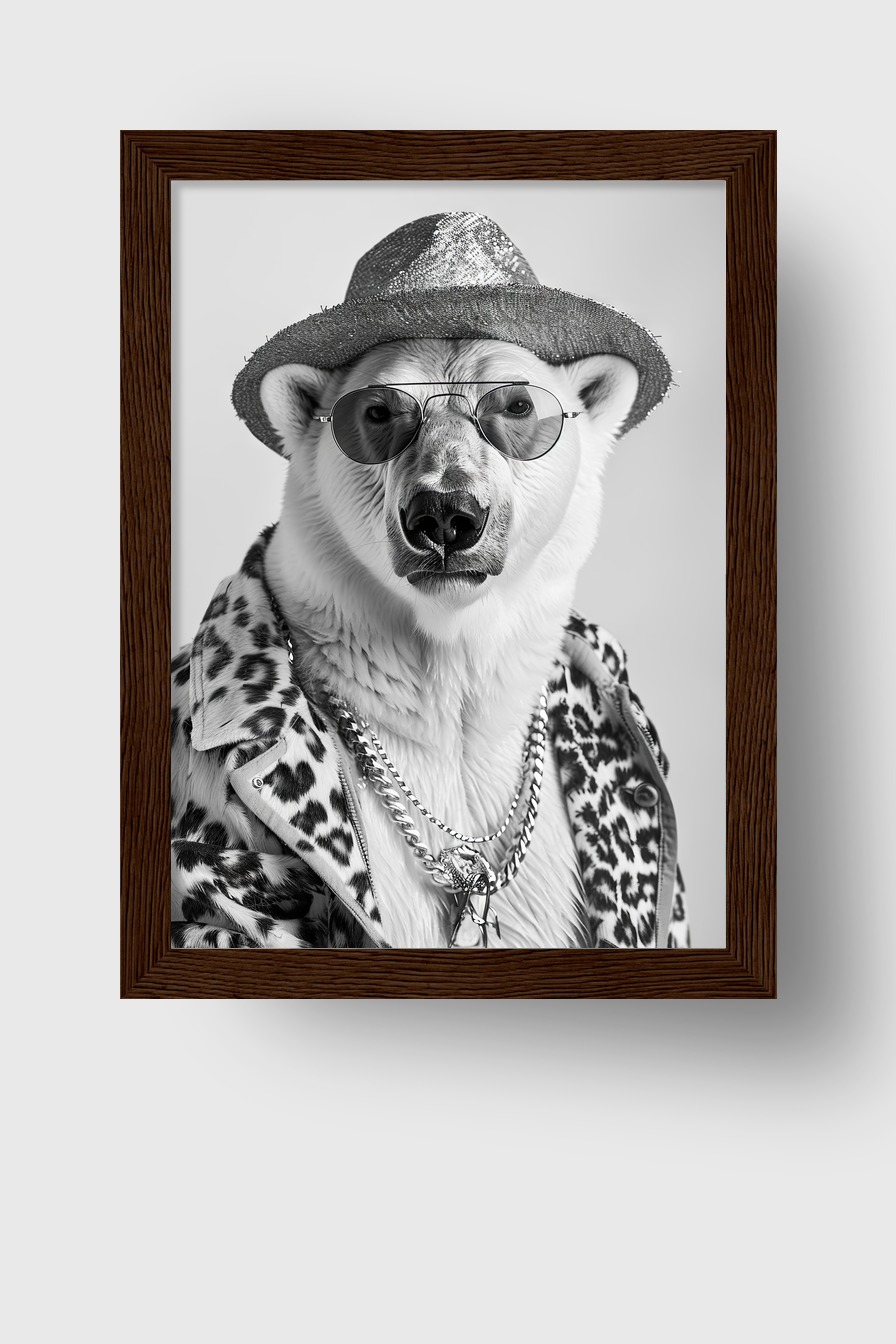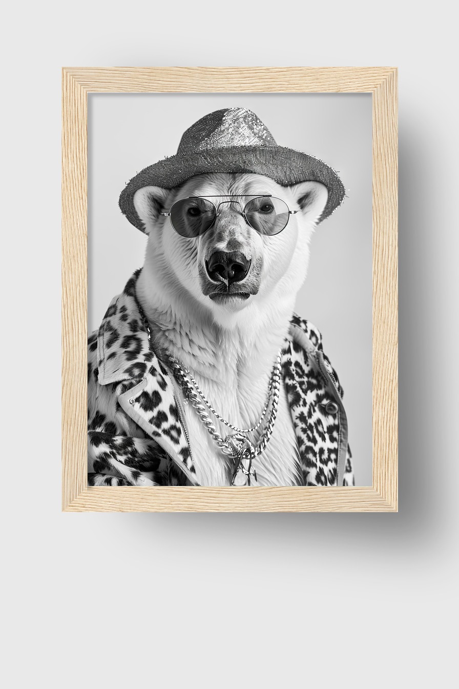 Das Porträt des Eisbären mit Hut hinter bruchsicherem Plexiglas in einem Kiefernholzrahmen (FSC-zertifiziert). Erhältlich in Schwarz, Weiß, Naturholz und Dunkelbraun. Fertig zum Aufhängen inklusive Aufhängeset.