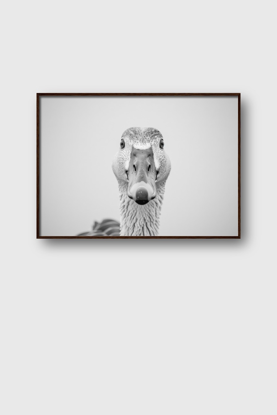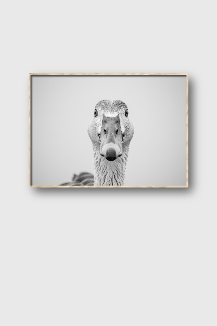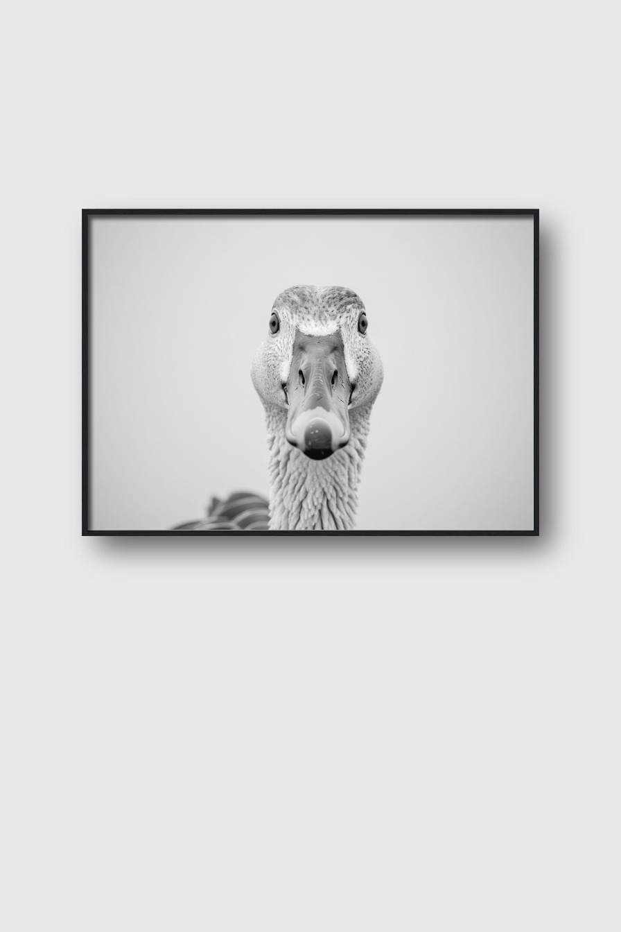Vor einem ruhigen, einfarbigen Hintergrund steht die Ente im Mittelpunkt und wirkt fast greifbar nah. Die Konzentration auf das Gesicht und die Augen verstärkt die Wirkung des Bildes im Raum.