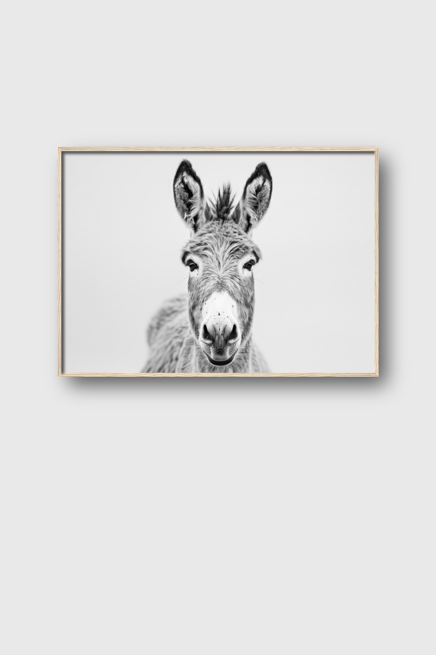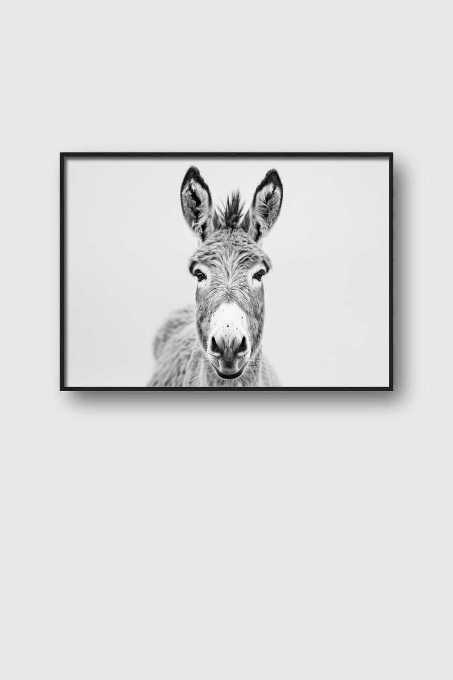 Das Bild wirkt ruhig und konzentriert durch den Fokus auf das Eselsgesicht in Schwarz-Weiß.