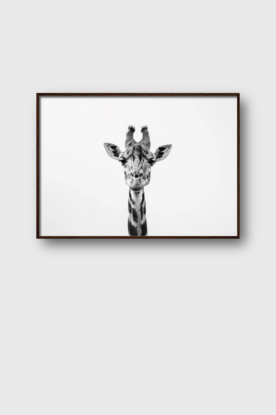 Im Raum steht die Giraffe mit klarer Präsenz, die durch den minimalistischen Hintergrund und die ruhige Komposition eine edle, fast monumentale Wirkung entfaltet.