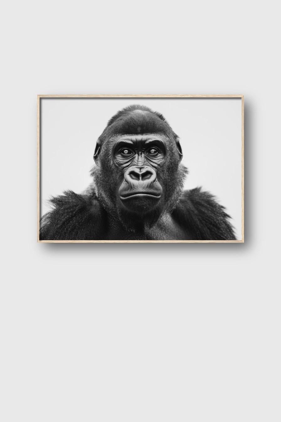 Im Raum wirkt das Bild durch seinen minimalistischen Hintergrund besonders konzentriert und präsent. Der konzentrierte Blick des Gorillas schafft eine beinahe greifbare Nähe und zieht die Aufmerksamkeit auf sich.