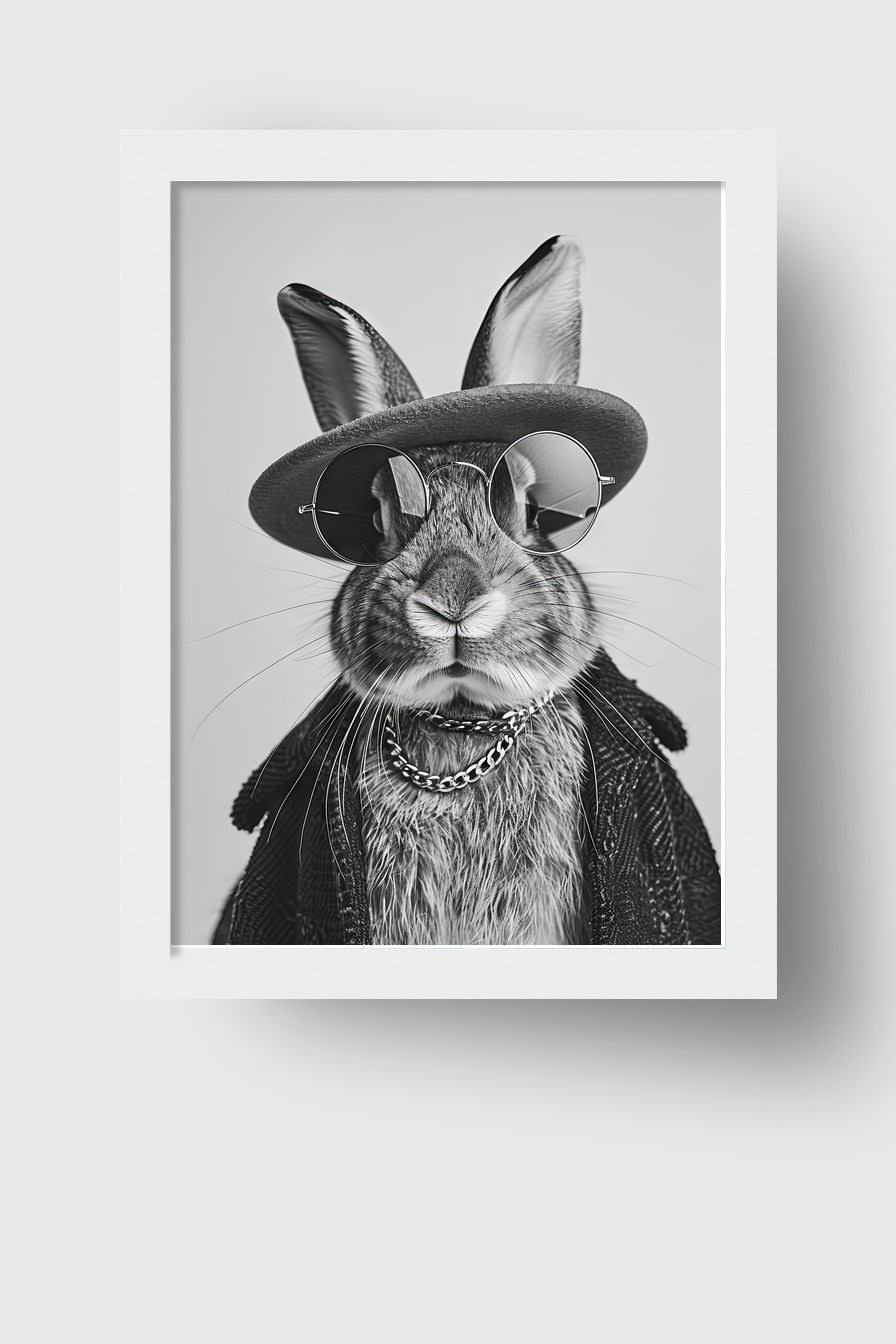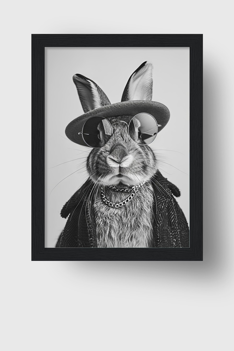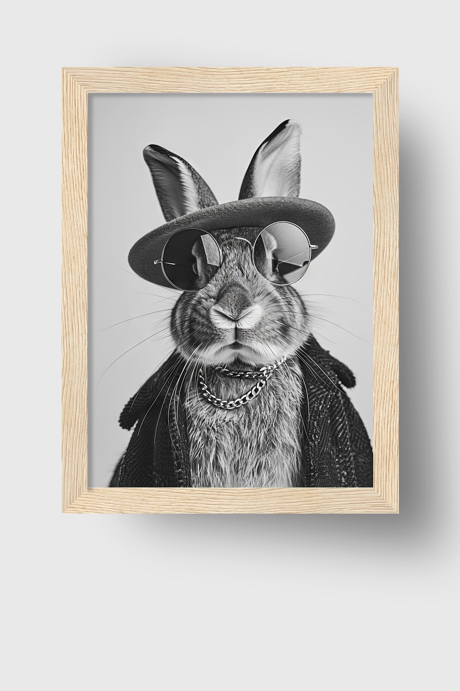 Ein Schwarz-Weiß-Porträt eines Hasen mit Sonnenbrille und Hut hinter bruchsicherem Plexiglas. Eingefasst in einen FSC-zertifizierten Kiefernholzrahmen, erhältlich in verschiedenen Farben. Fertig zum Aufhängen mit Aufhängeset.