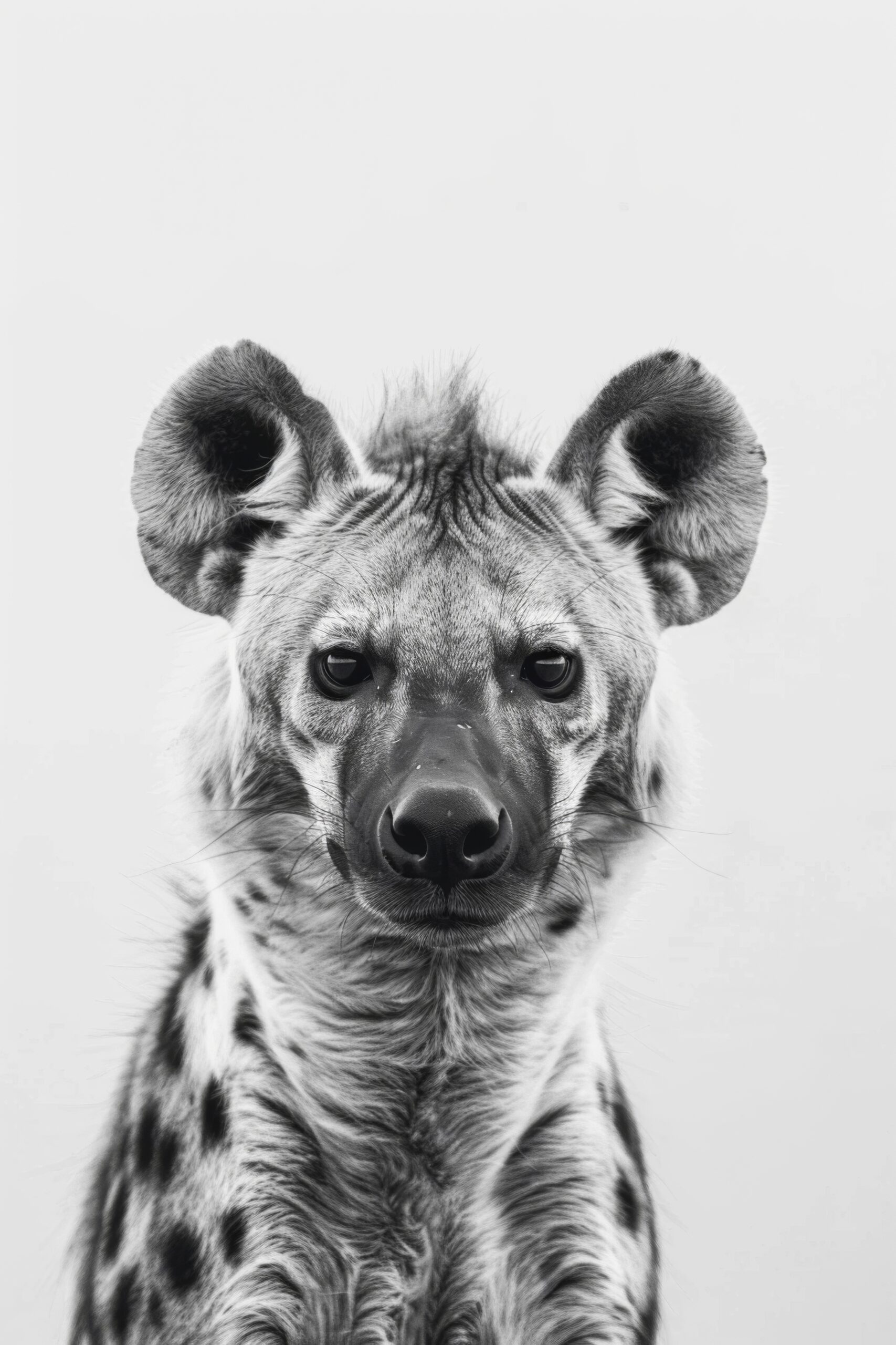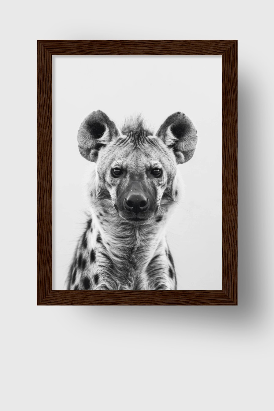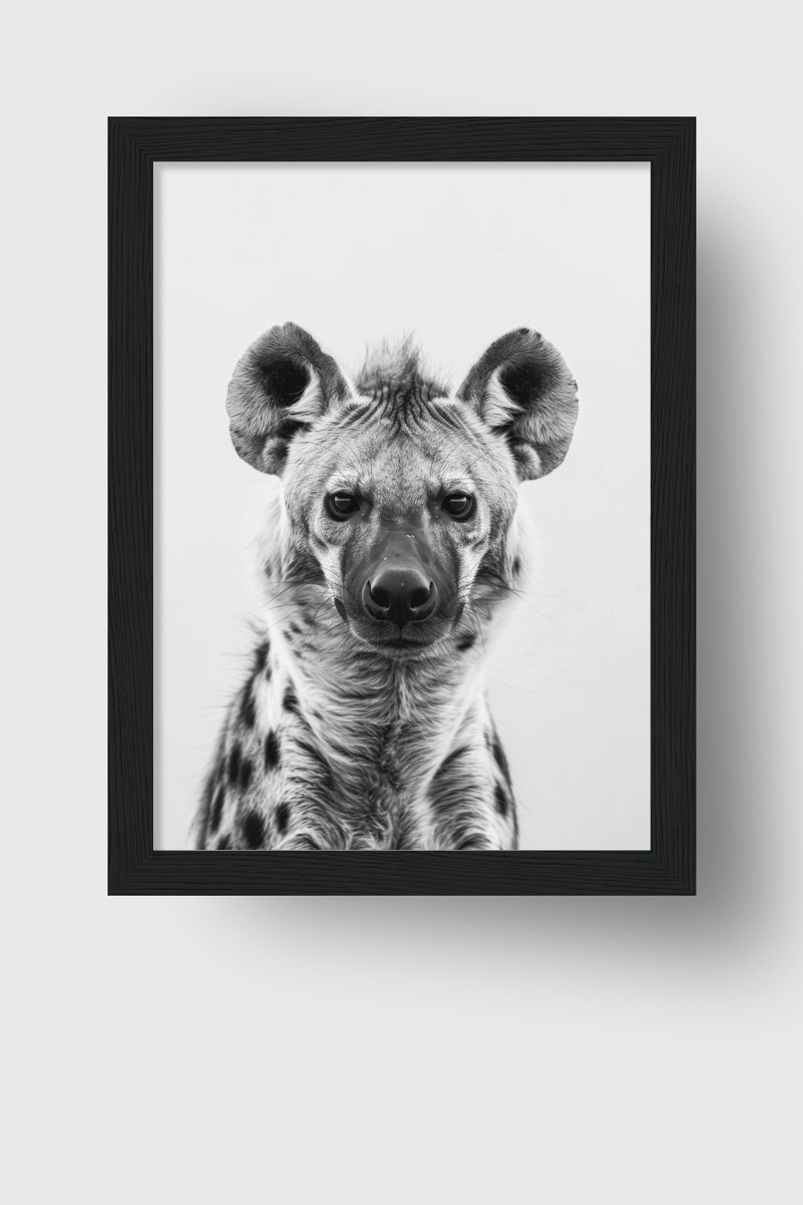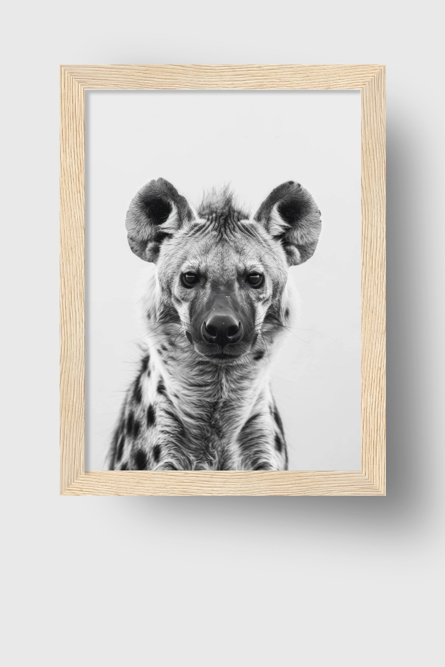 Die fronale Haltung der Hyäne wirkt im Raum direkt und fesselnd, während das zurückhaltende Farbschema für eine stilvolle Präsenz sorgt. Das Bild zieht den Blick an und lädt dazu ein, länger die Details und den charaktervollen Ausdruck des Tieres zu beobachten. Es bietet eine besondere Balance zwischen Kraft und Ruhe.