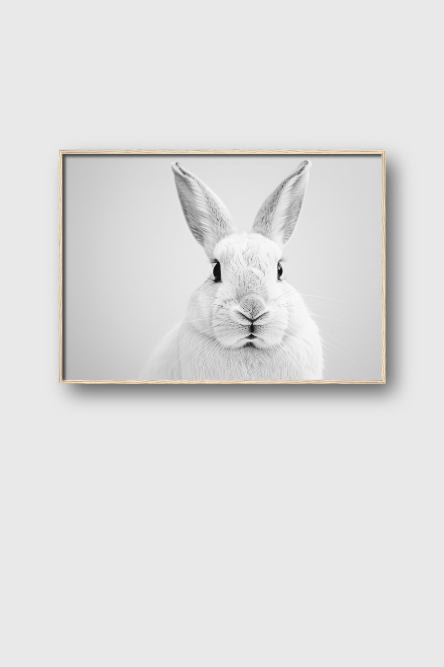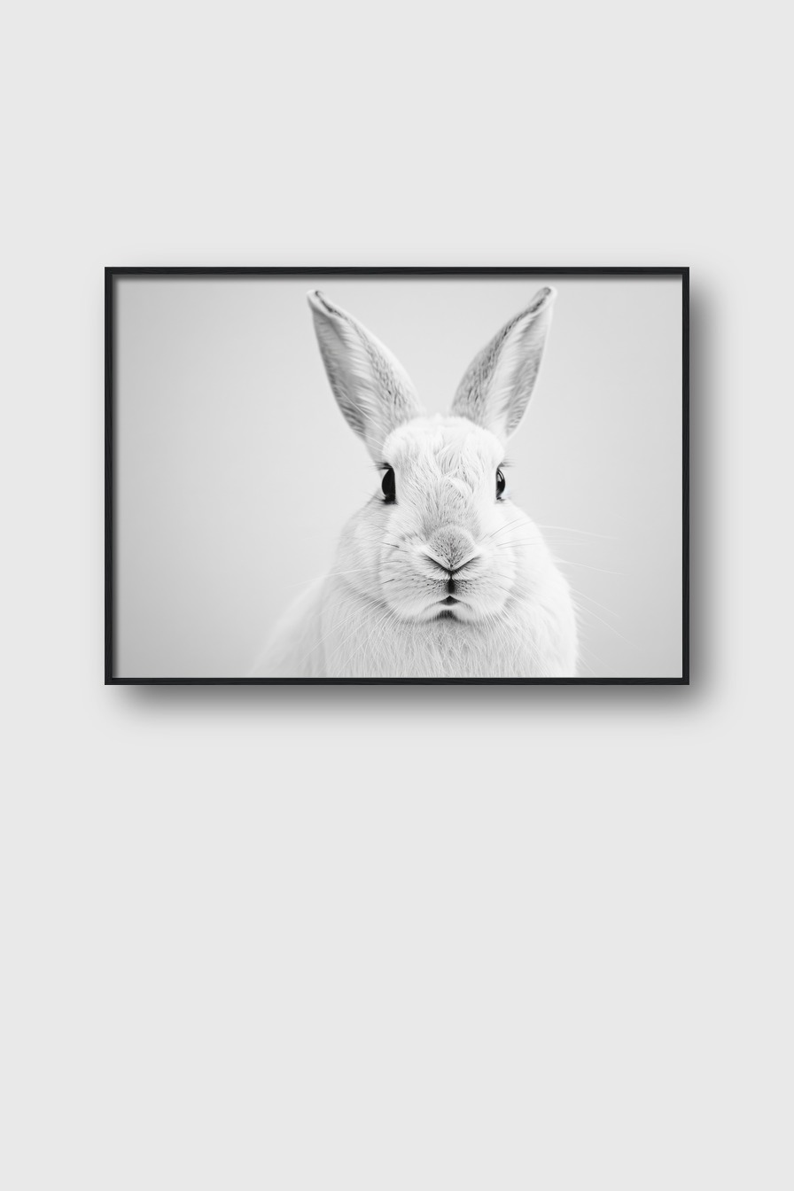 Sorgt im Raum für eine subtil elegante Präsenz. Der schnelle Fokus auf das Kaninchen nimmt Gedanken gefangen und bringt Ruhe in die Umgebung. Das Bild wird zum Blickfang ohne zu dominieren.