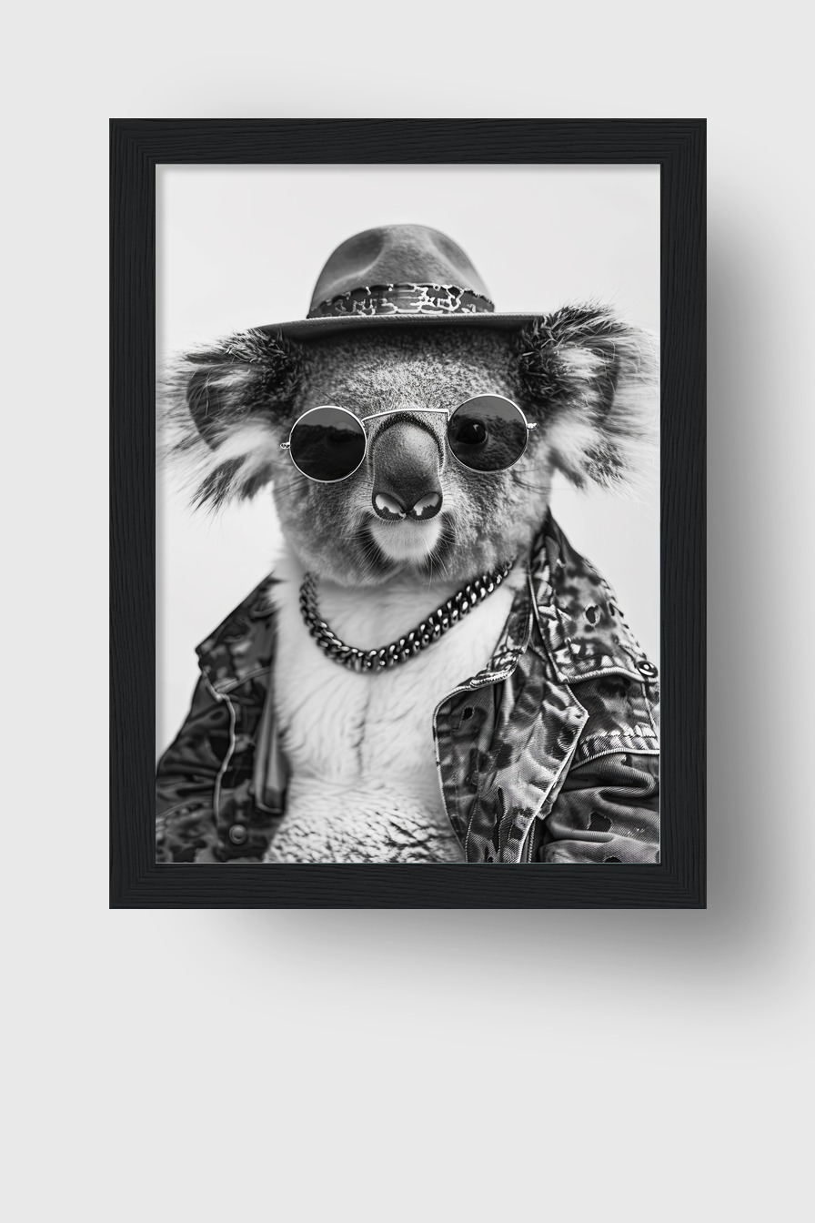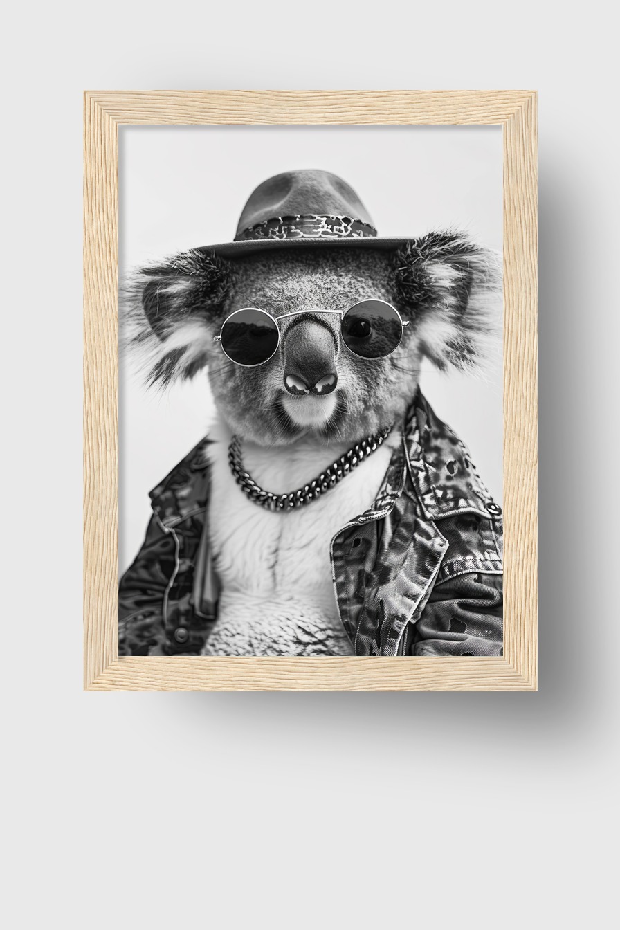 Das Poster zeigt Koala mit Sonnenbrille und Hut hinter bruchsicherem Plexiglas im Kiefernholzrahmen (FSC zertifiziert). Erhältlich in verschiedenen Farben. Fertig zum Aufhängen, inklusive Aufhängeset.