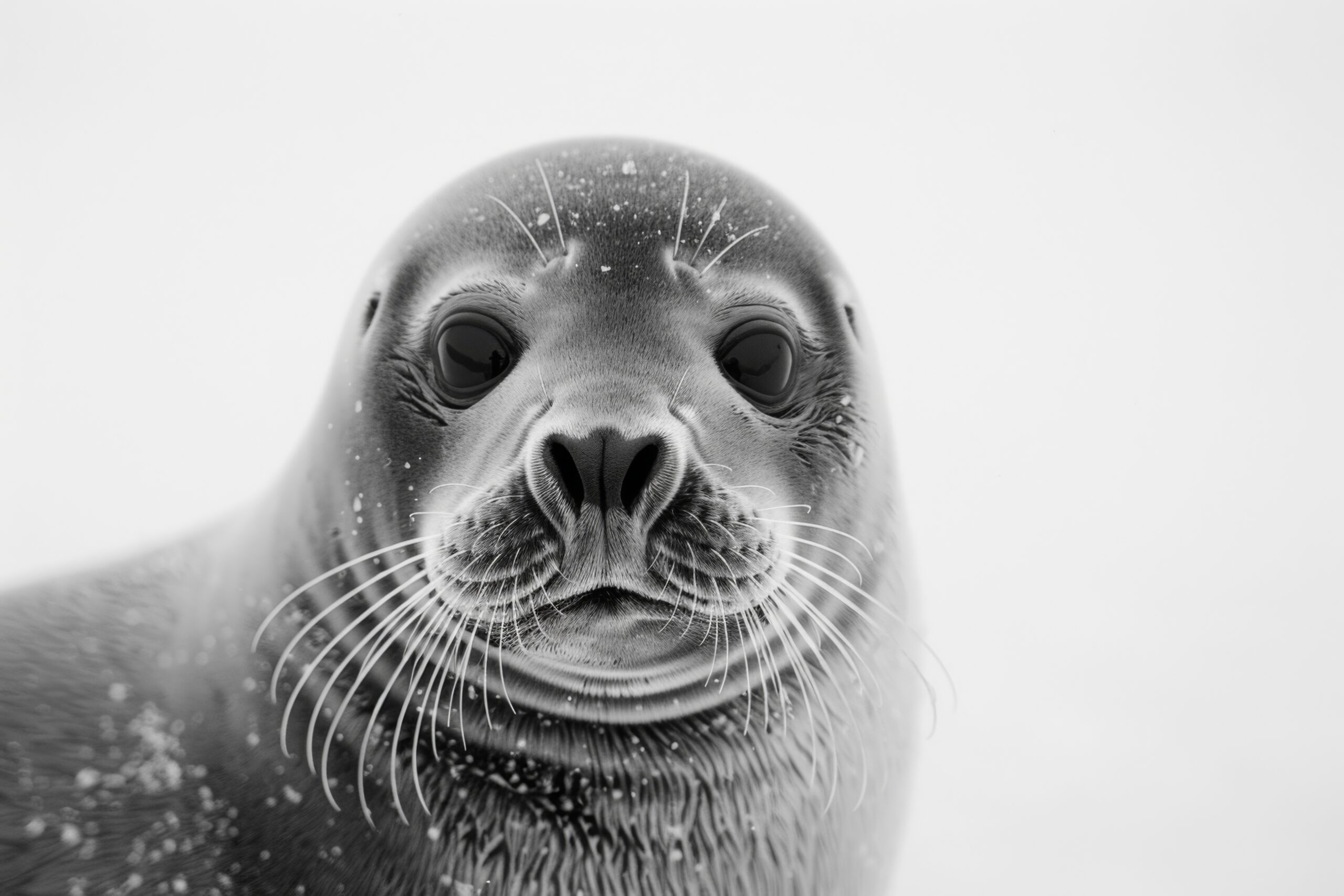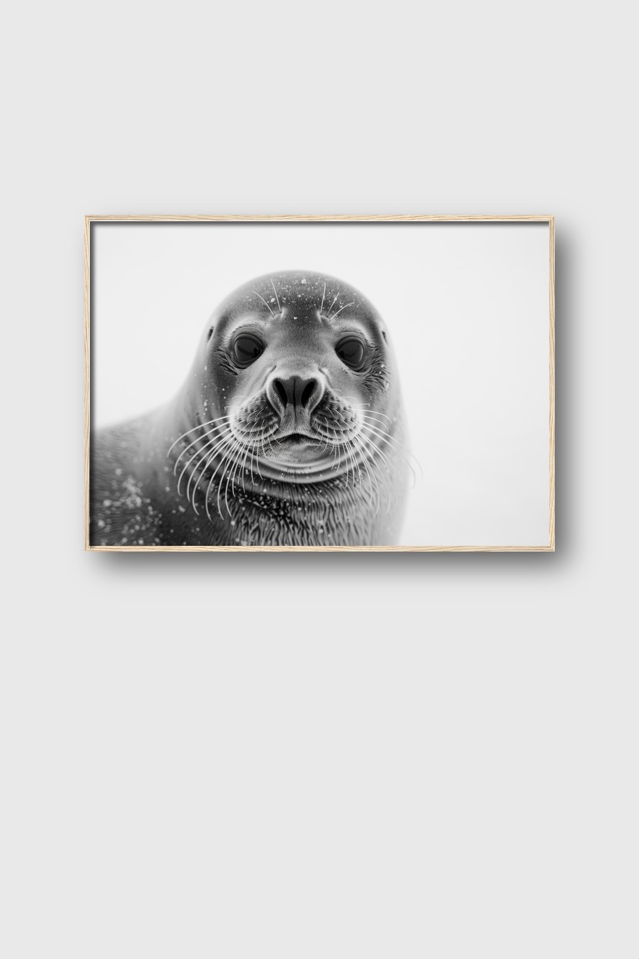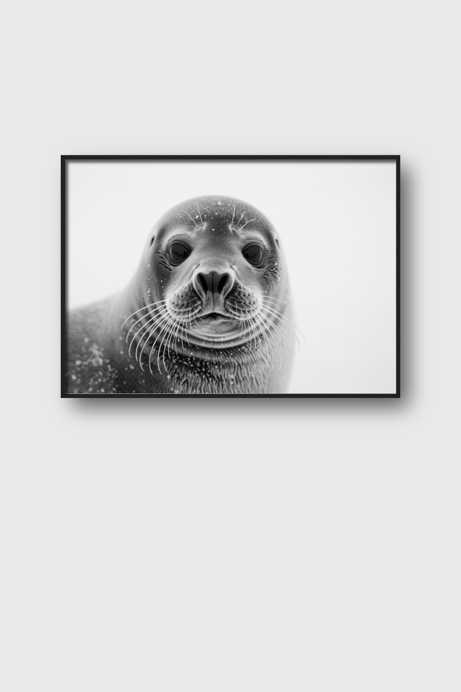 Im Raum wirkt die Robbe direkt und eindringlich. Das monochrome Bild schafft Kontrast und Ruhe zugleich. Es bringt eine natürliche Kühle und Ruhe, die stets präsent bleibt.