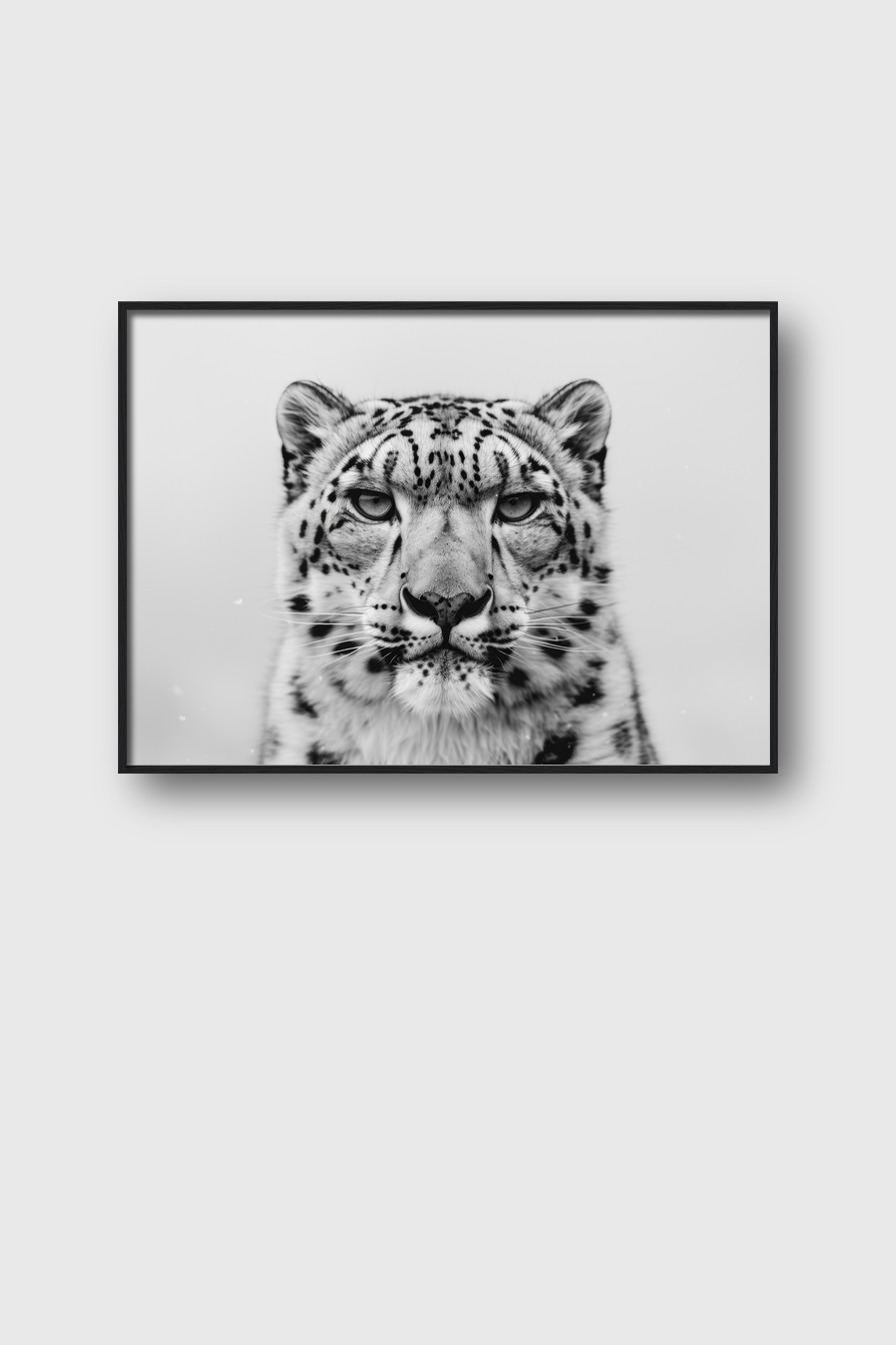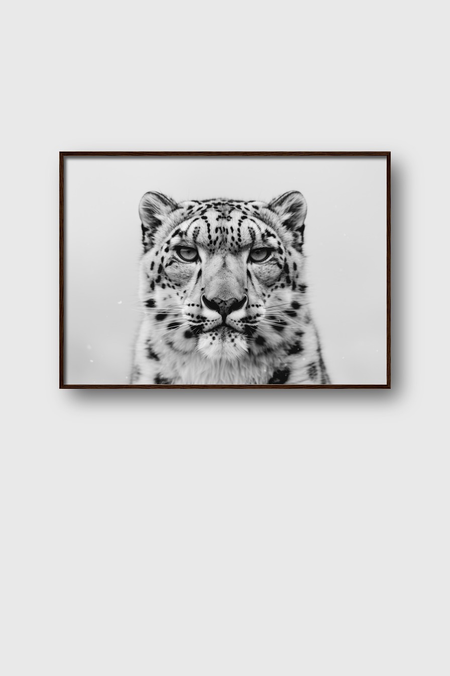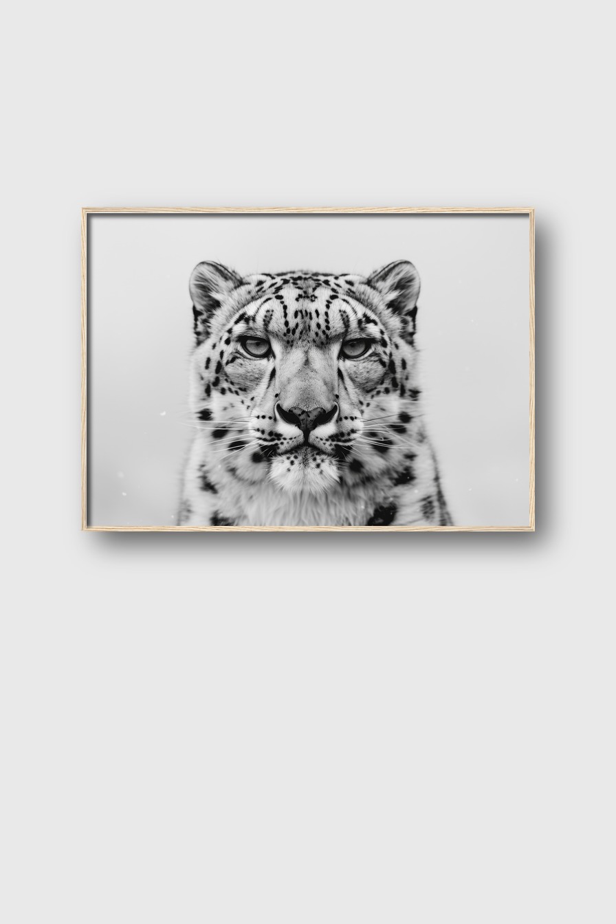 Im Raum wirkt der Kopf des Schneeleoparden prägnant und reduziert. Schlicht und auffällig zugleich.