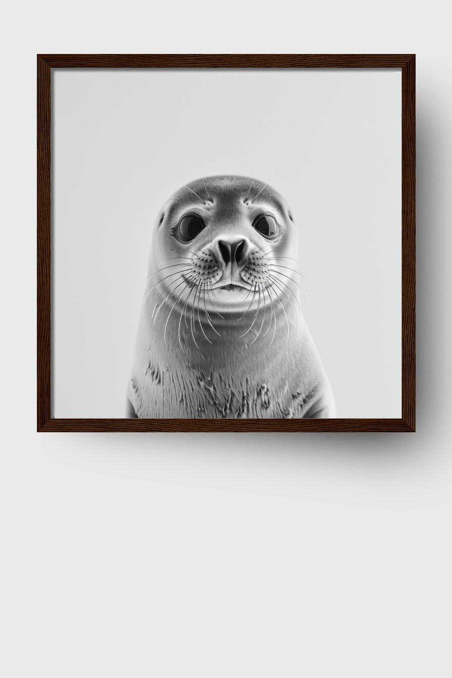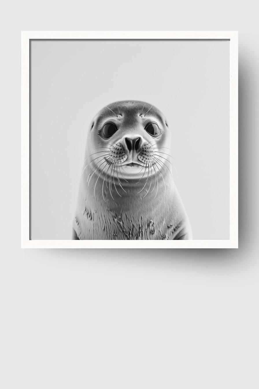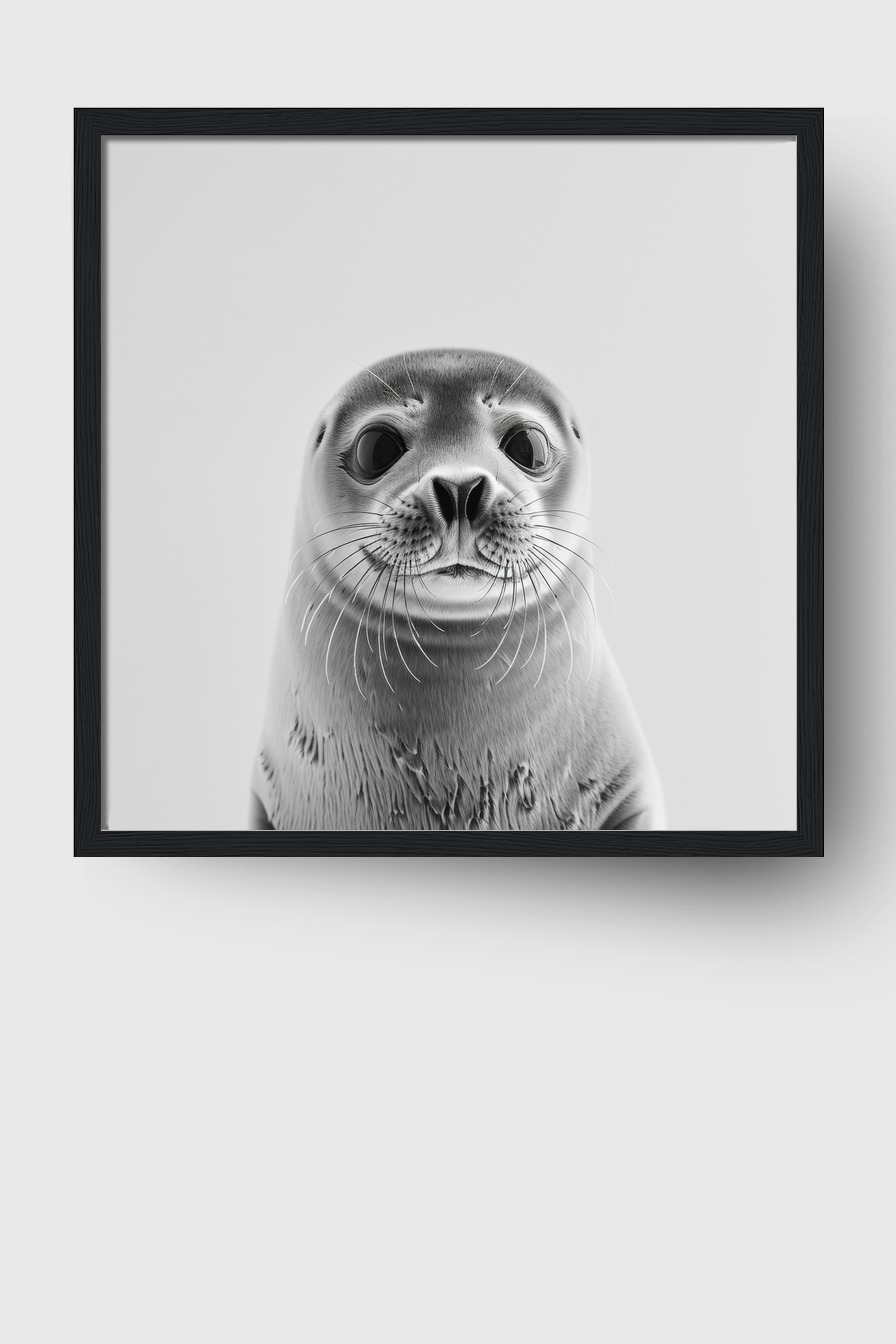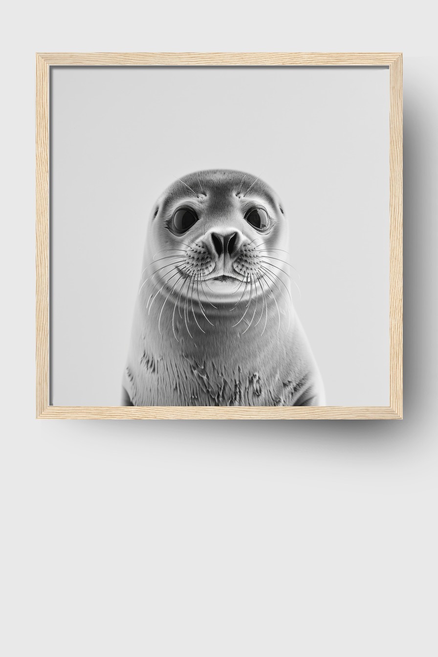 Im Raum wird das ruhige Porträt zum Blickfang, der durch die monochrome Gestaltung besticht. Die reduzierte Komposition bringt eine harmonische Balance, die dem Seehund viel Ausdruckskraft verleiht.