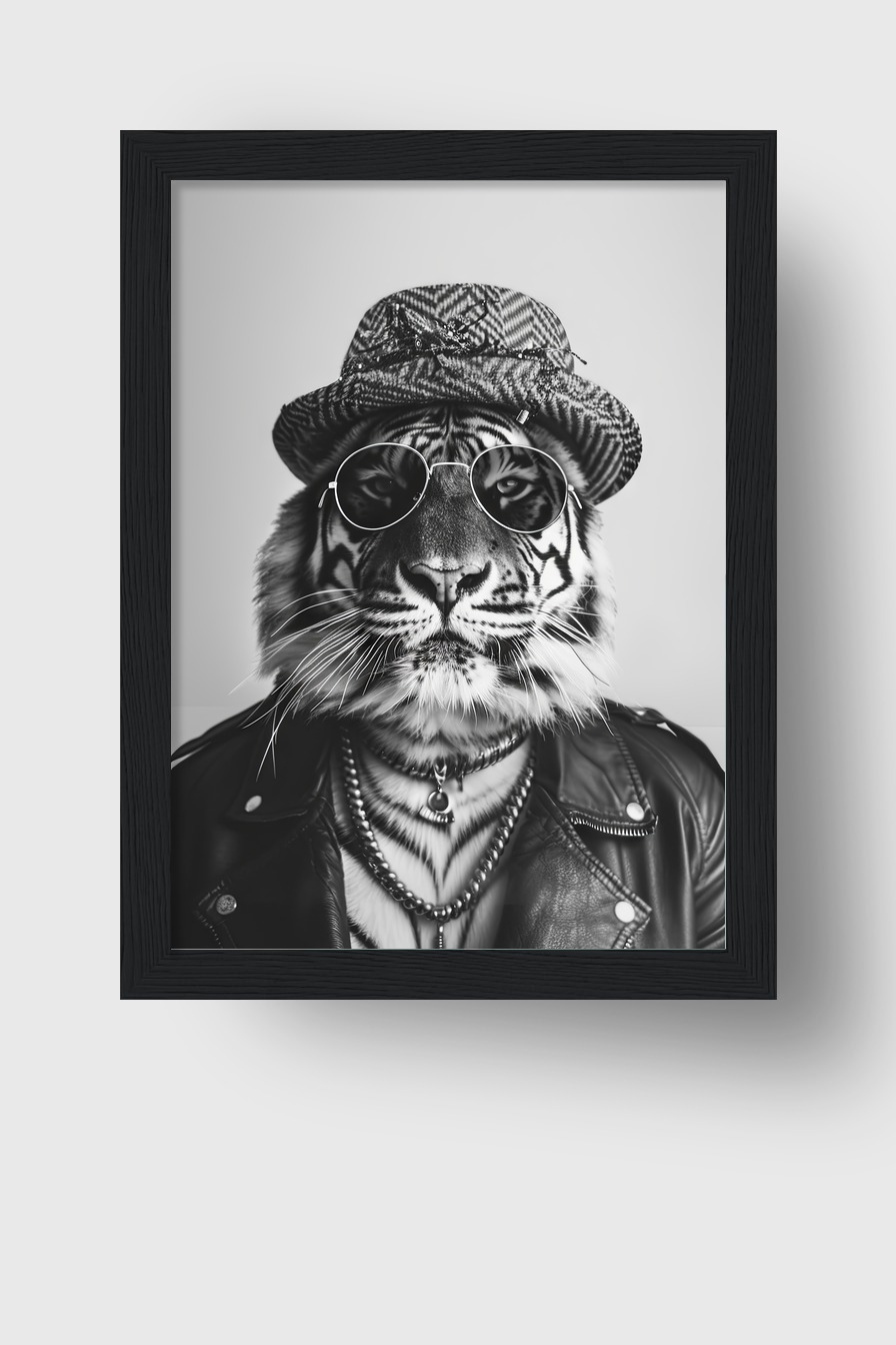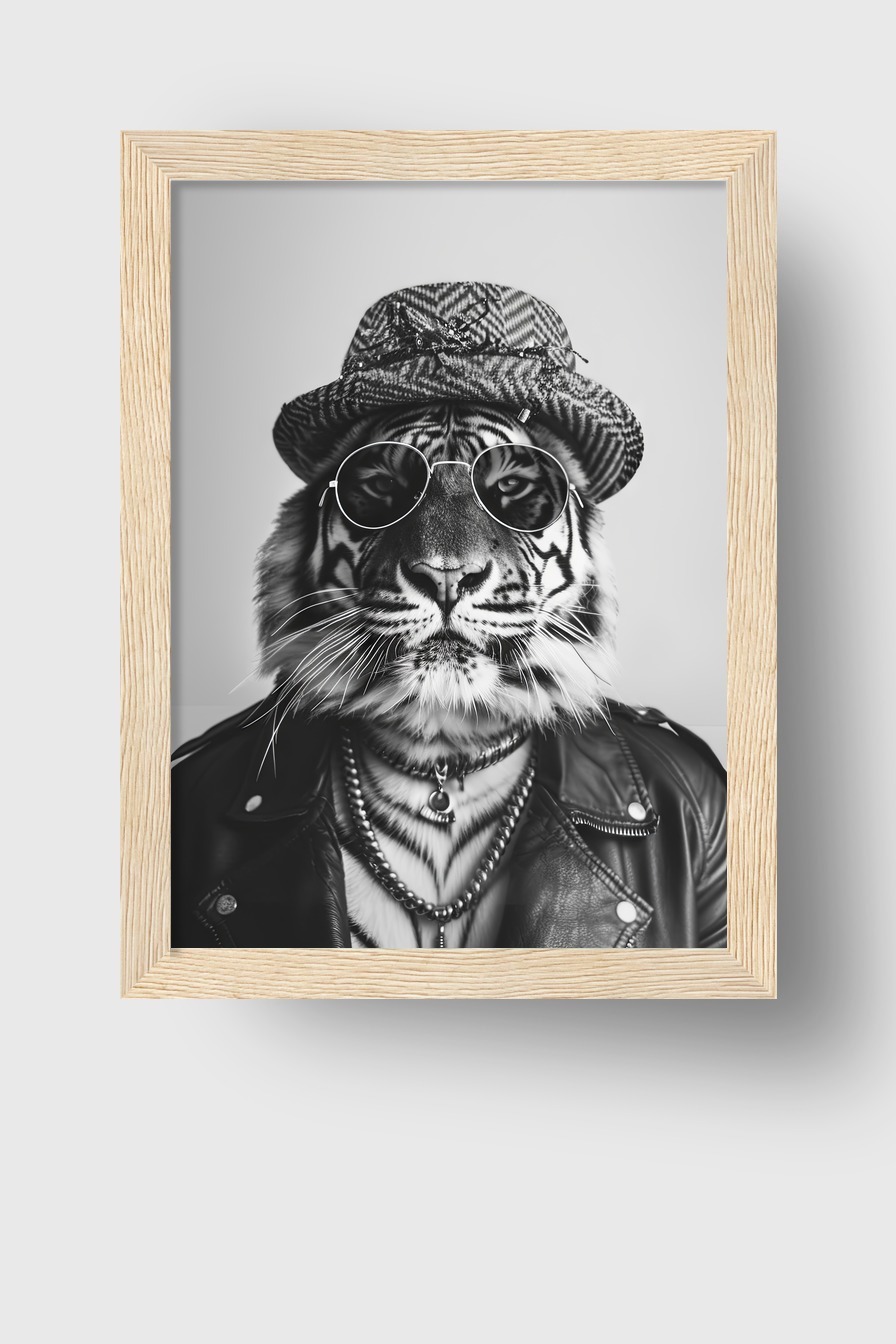 Ein stilvoller Tiger trägt Hut, Sonnenbrille und Lederjacke. Das Bild wirkt modern und lässig in Schwarz-Weiß.
