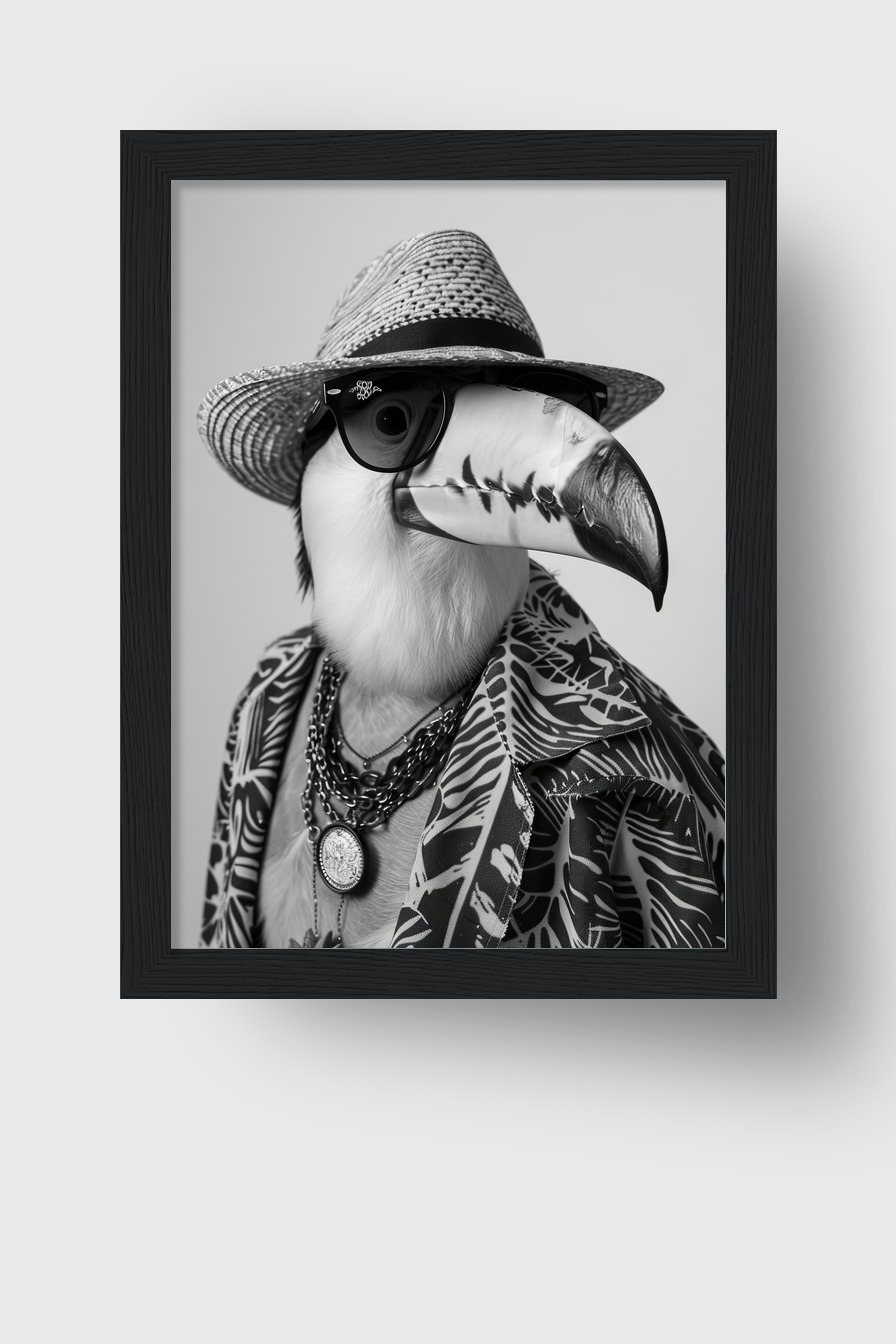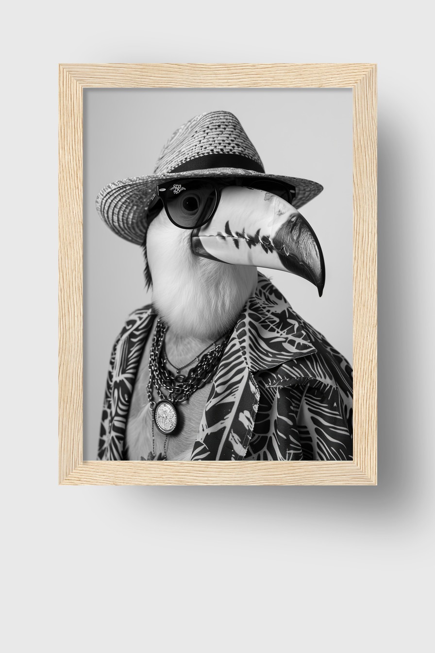 Ein Tukan mit Hut und gemustertem Hemd in Schwarz-Weiß. Poster (170 g/m², halbmatt) hinter bruchsicherem Plexiglas in FSC-zertifiziertem Kiefernholzrahmen. Erhältlich in mehreren Farben. Fertig zum Aufhängen, inklusive Aufhängeset.