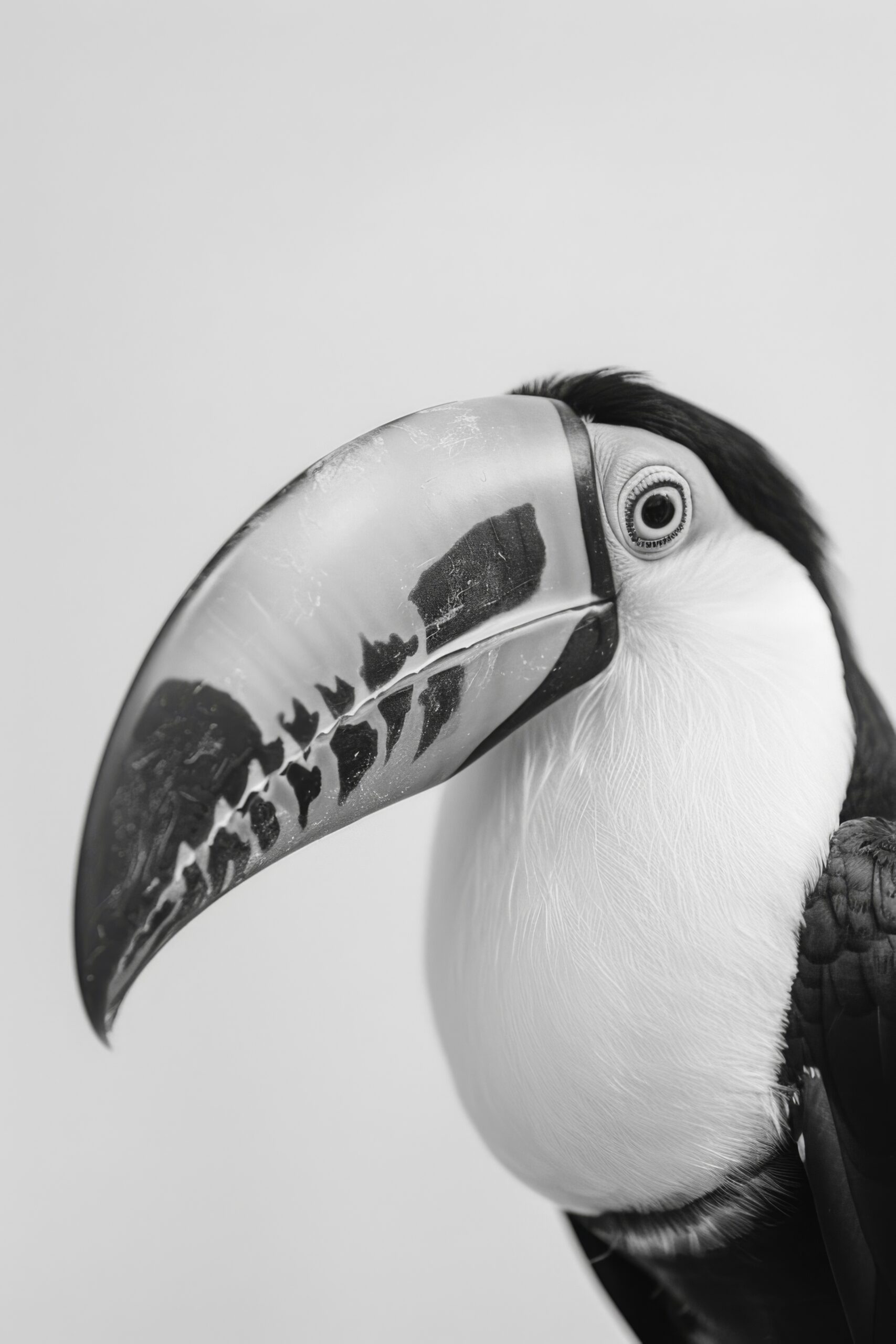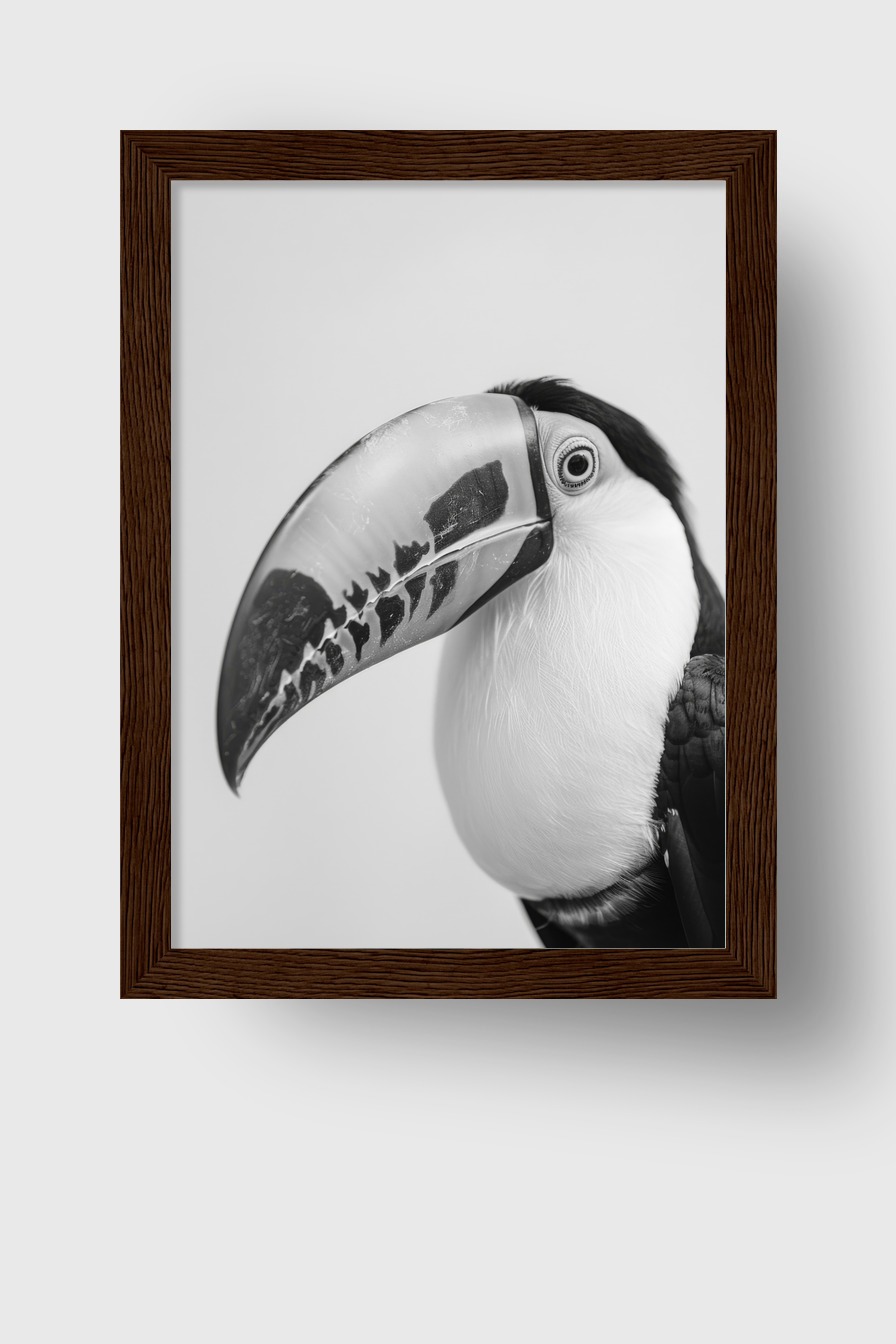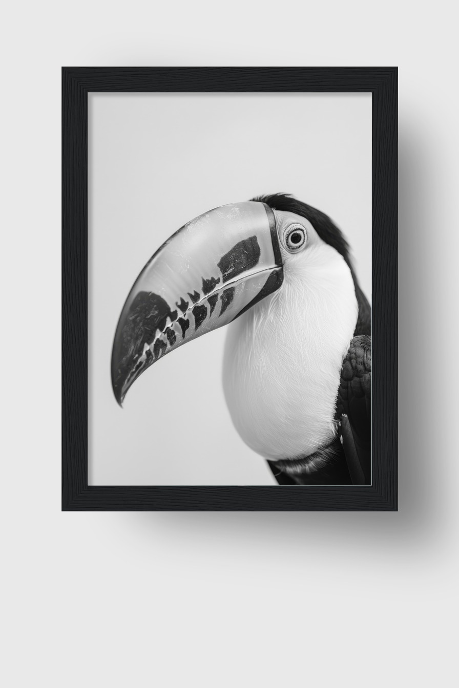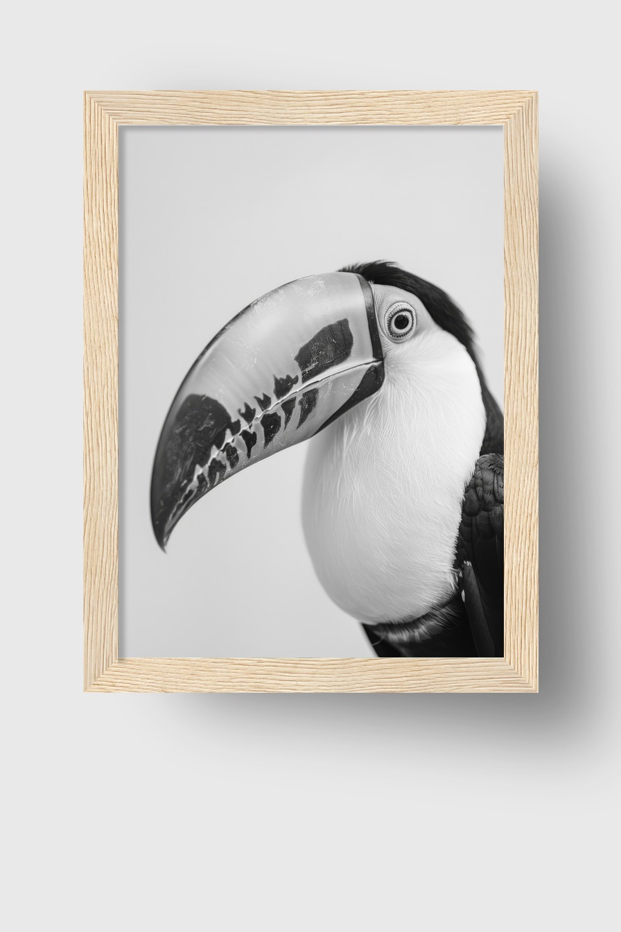 Im Raum zieht der Tukan mit seinem imposanten Schnabel alle Blicke auf sich. Die subtil unterschiedlichen Grautöne fangen die filigranen Federn ein und erzeugen eine harmonische Ruhe. Die reduzierte Farbgebung macht das Motiv zu einem eleganten Blickfang.