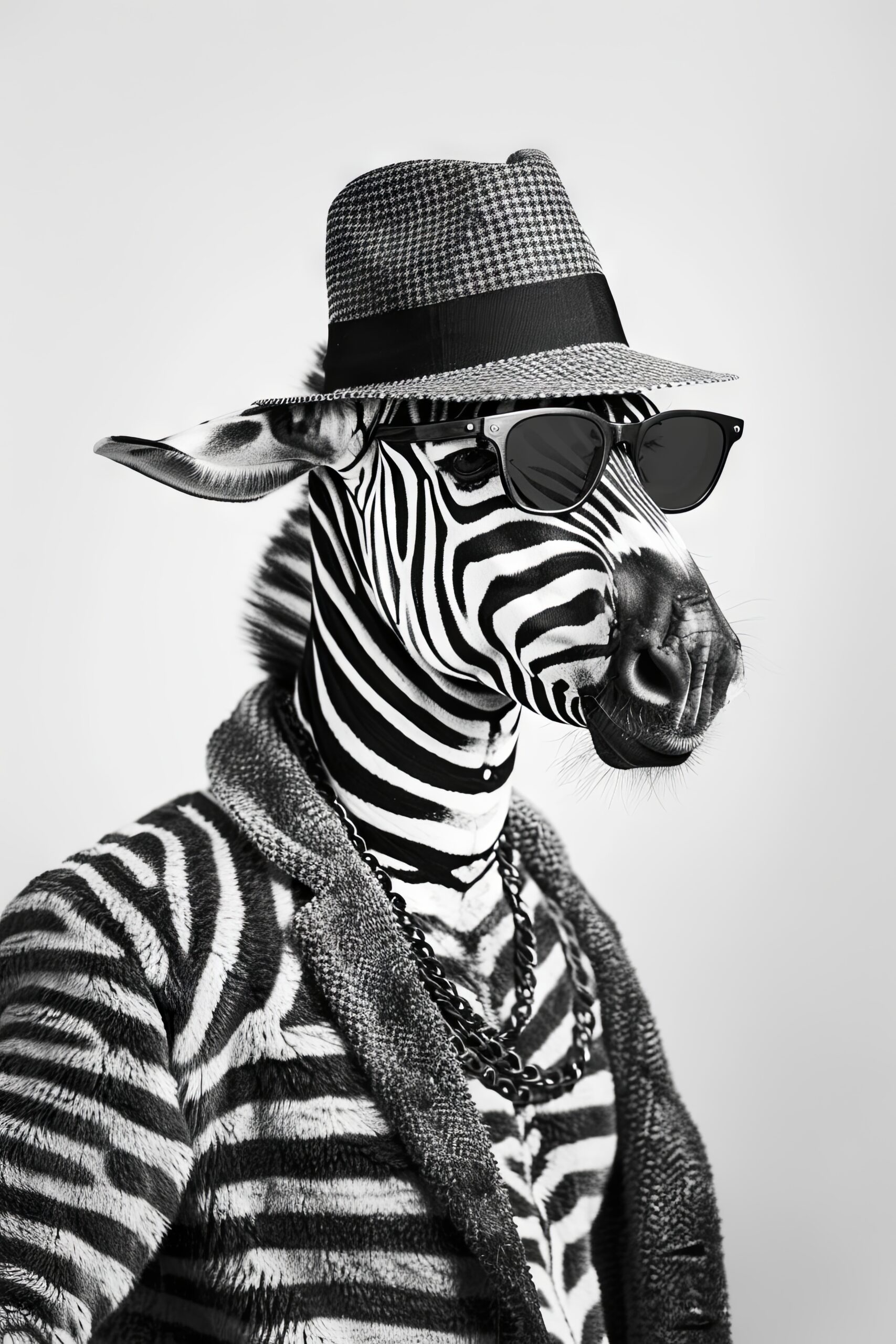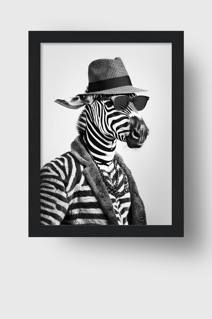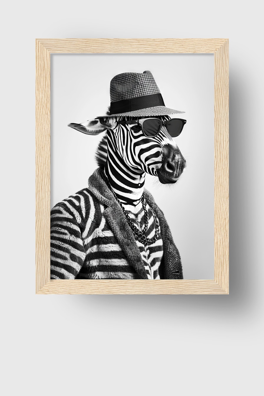 Schwarz-weißes Zebraportrait mit Hut und Sonnenbrille als Poster (170 g/m², halbmatt) hinter bruchsicherem Plexiglas in einem Kiefernholzrahmen (FSC-zertifiziert). Erhältlich in mehreren Holzfarben. Fertig zum Aufhängen inklusive Aufhängeset.